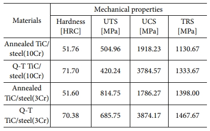 로크웰 경도의 경우, 어닐링 열처리 후 TiC/steel 금속복합재료는 약 51 HRC, 퀜칭-템퍼링 열처리 후 TiC/steel 금속복합재료는 약 71 HRC를 나타낸다. 퀜칭-템퍼링 열처리 후 경도가 크게 증가한 이유는 Fe-합금 기지내의 마르텐사이트 조직에 의한 영향으로 판단된다.