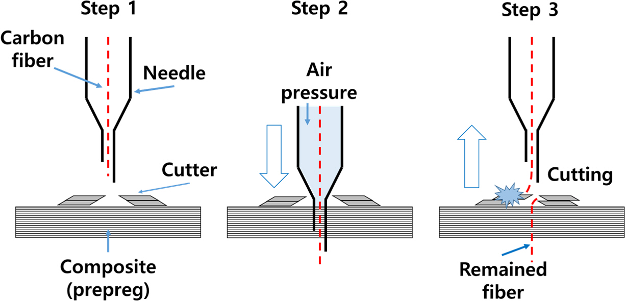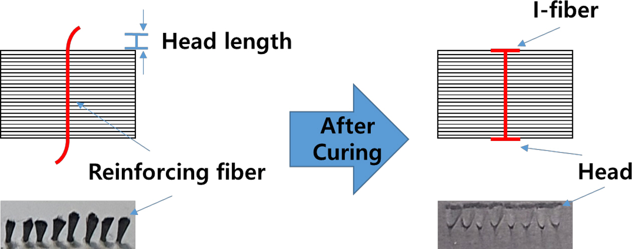 I-fiber 공법으로 보강된 Single-lap joint 시편을 제작하여 시험편의 강도특성과 파손신호 검출능을 평가하였다. I-fiber 스티칭 공법은 Fig. 1에서 보는 바와 같이, 탄소 섬유가 내장된 중공 바늘을 Prepreg에 삽입하여 공압으로 방출하는 공정으로 되어 있으며, 경화 후 Fig. 2와 같은 I 형상의 헤드를 형성하여 볼트, 너트와 같은 보강효과를 가지고 있다.