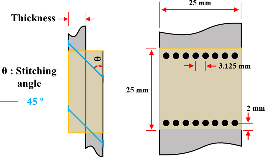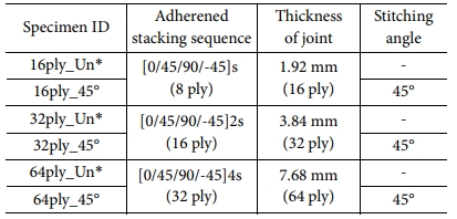 Single-lap joint 시편 형상은 ASTM 5868, 1002 규격을 적용하였으며, 오토클레이브 진공백 성형법을 통해 Co-curing 방식으로 제작하였다. 적층 패턴은 Quasi-Isotropic인 [0/45/90/-45]ns이며, Fig. 3과 같이 Peel stress 및 Shear stress가 집중되는 체결부 양끝단에 I-fiber 스티칭 보강공정을 적용하였다. 보강 섬유의 삽입 각도는 보강효과가 우수한 45°로 선정하였으며, 복합재의 두께와 스티칭 유, 무에 따라 총 6가지 시험편을 제작하였으며, 각 항목을 Table 1에 나타내었다.