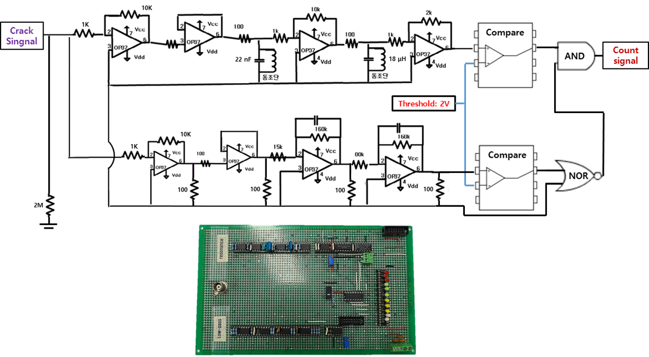 탄소섬유 복합재료는 섬유파단, 수지파단, 계면파단 등 다양한 형태의 파손이 발생할 수 있으며, 이 때 특정 주파수를 가진 AE 신호가 발생된다. 섬유파단을 동반한 복합재의 파손이 발생될 때 230 kHz의 신호가 발생되므로, 본 논문에서는 이를 검출하는 회로를 설계, 제작하였다. Fig. 4는 230 kHz의 AE신호를 검출하여 카운팅 할 수 있는 회로로서, AE센서와 증폭기를 통해 입력된 신호를 동조필터와 저역통과필터의 조합으로 이루어진 회로를 통하여 230 kHz성분을 추출하도록 구성되어 있다. 채널 1에서는 L(Coil) - C(Capacitance) 동조필터를 이용하여 230 kHz의 주파수 신호만 추출하도록 되어 있으며, 채널 2에서는 R(Resistance) - L(Coil) 저역필터와 NOR게이트를 이용하여 1 kHz 이하의 Noise 신호를 제거하도록 구성되어 있다. 채널 1, 2 신호는 AND게이트로 연결되어 있어 저주파 노이즈를 제거한 AE신호를 카운팅 하도록 구성되어 있다.