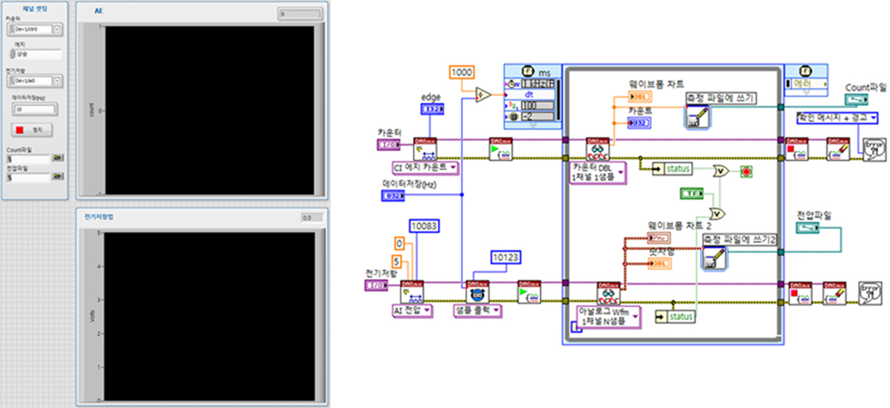 AE 회로와 전기저항법 회로에서 출력되는 신호는 NI社의 DAQ장비와 LabVIEW 소프트웨어를 이용하여 Fig. 7과 같은 모니터링 시스템을 구축하였다.