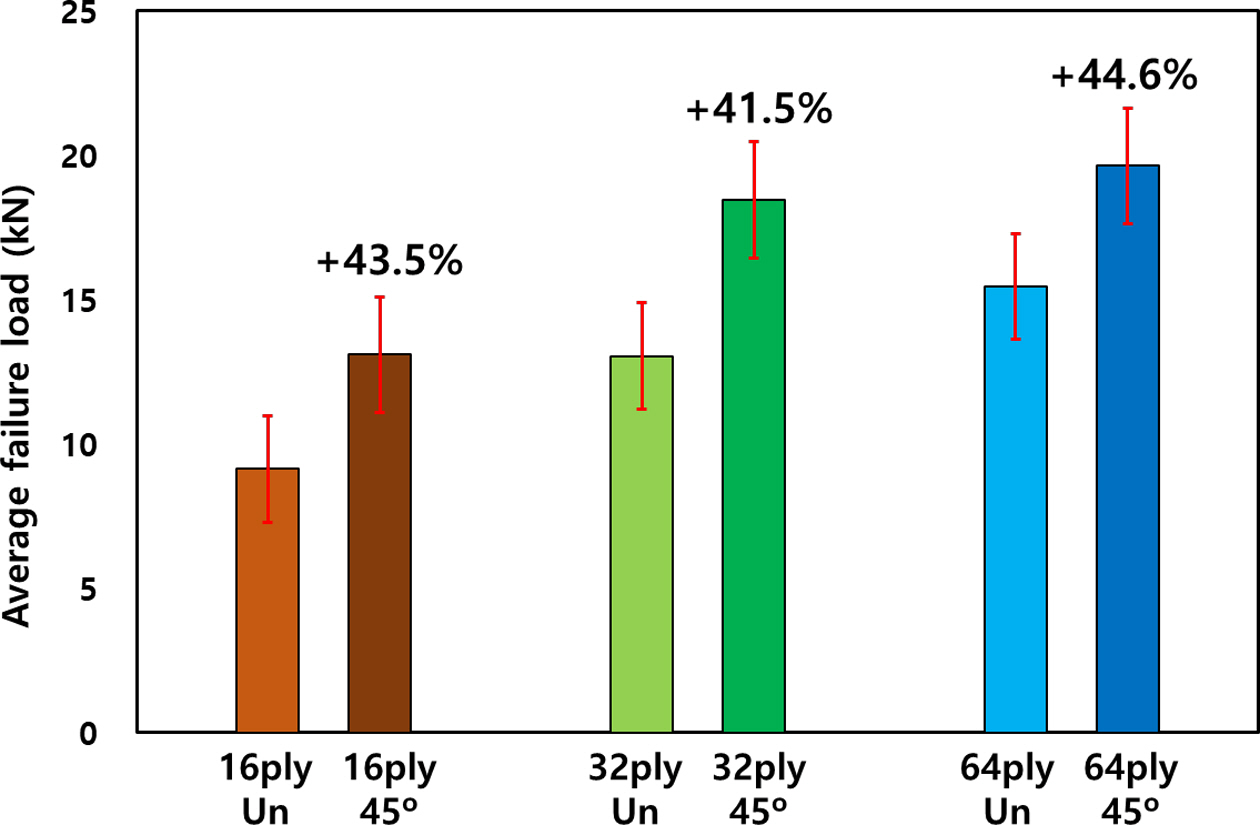 Fig. 11은 I-fiber 스티칭으로 보강한 Single-lap joint의 강도향상효과를 정리한 그래프로서, 스티칭 보강이 없는 시편대비 16-ply는 43.5%, 32-ply는 41.5%, 64-ply는 44.6%의 강도향상효과가 있음을 확인할 수 있었다.
