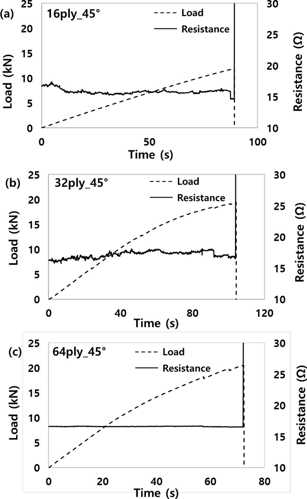 Fig. 12는 I-fiber 스티칭으로 보강된 Single-lap joint 시편을 전기저항법으로 파손 모니터링한 결과로서, 모재의 두께와 관계없이 급작스런 파손이 발생하는 순간에 큰 저항변화가 감지되며, 파손 후 시편의 저항값이 무한대가 됨을 확인하였다.
