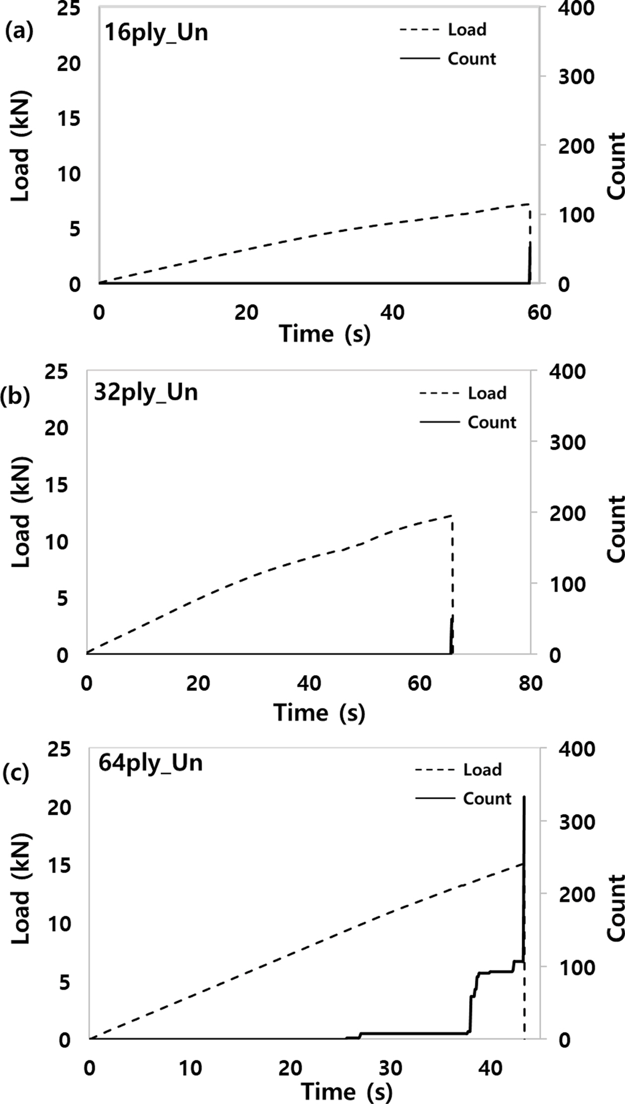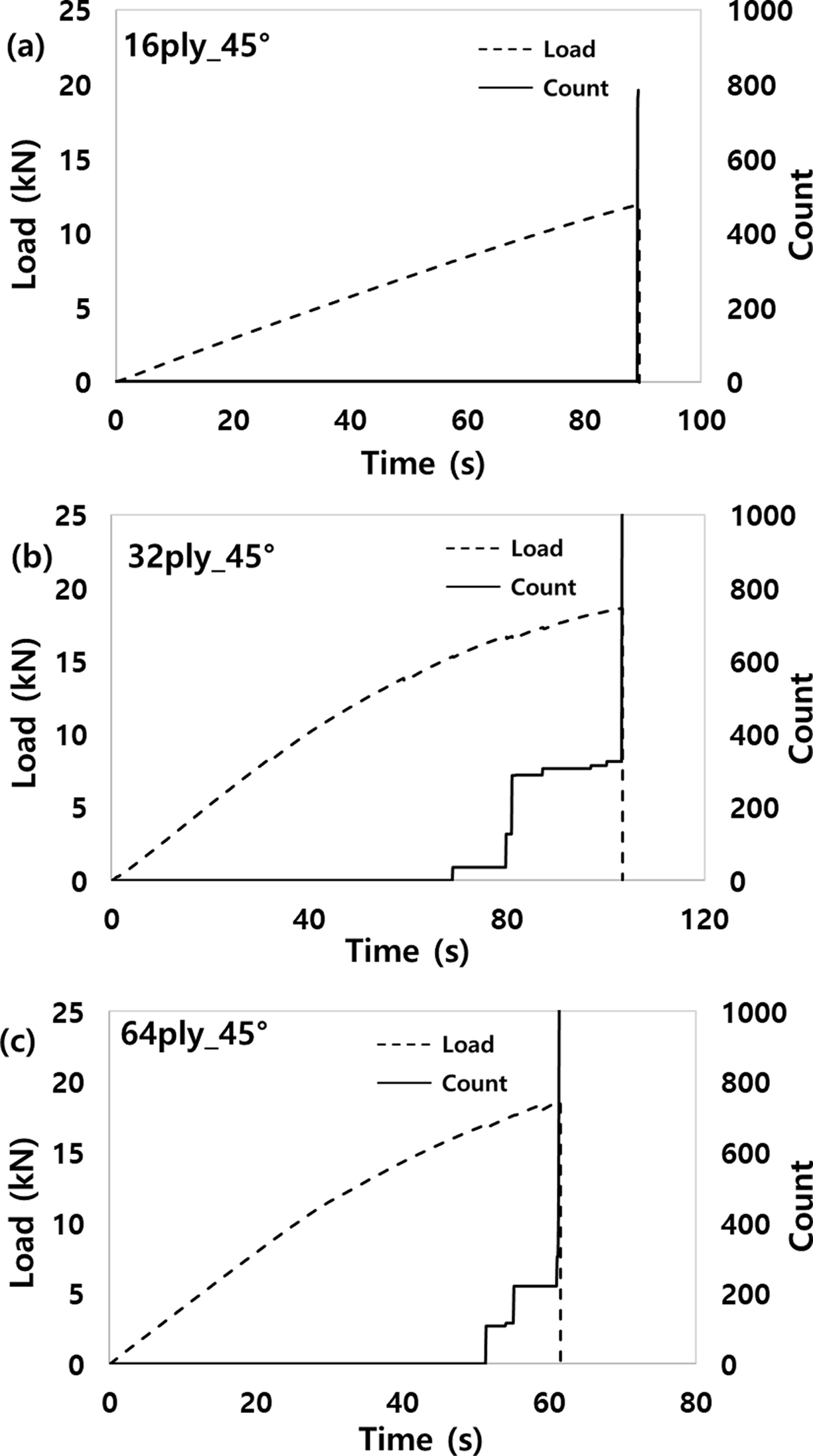 Fig. 14는 I-fiber로 보강된 Single-lap joint시편을 AE법으로 파손 모니터링한 결과로서, 모재의 두께와 관계없이 최종파손이 일어나는 시점에서 다수의 AE신호가 검출되었다. 32-ply와 64-ply에서는 최종파손이 발생하기 전부터 AE신호가 발생되었으며, 이는 I-fiber의 일부분과 체결부 양끝단에서 최초의 파손이 발생될 때 검출된 AE신호라고 판단된다. 또한, 스티칭 보강이 없는 Fig. 13의 AE신호 카운트 수보다 스티칭된 Fig. 14의 AE신호 카운트 수가 높은 값을 가짐을 확인할 수 있다. 이는 스티칭된 Single-lap joint시편에 파손이 발생할 때 다수의 I-fiber에도 파손이 발생되므로, 이때 발생된 추가적인 AE신호라고 추정된다.