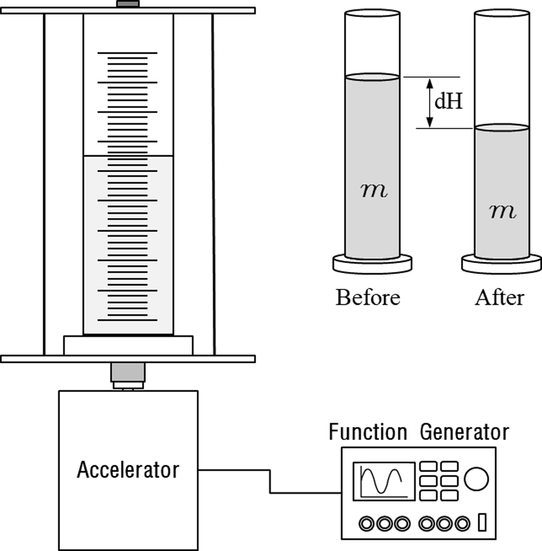 알루미나 파우더에 가진하여 변화된 높이를 측정하기 위해 Fig. 1과 같이 실험 장치를 구성하였다. 함수 발생기를 이용하여 사인파형의 신호를 진동발생기(Smart Shaker K2007E01, PCB, USA)에 전달하여 알루미나 파우더에 가진하였다. 파우더의 충진율 분석하기 위해 가진 전후 파우더의 높이 변화를(dH) 확인할 수 있는 표준 PMMA 소재 매스 실린더(내경 23.6 mm)를 사용하였으며 진동 발생기 위에 고정장치구를 이용하여 부착하였다. 그리고 Al2O3 함량이 99.7% 이상이고 평균 지름이 10 μm~50 μm인 구형 알루미나(DSP-A Series, Dongkuk R&S Co. Ltd., Korea)를 사용하였다.