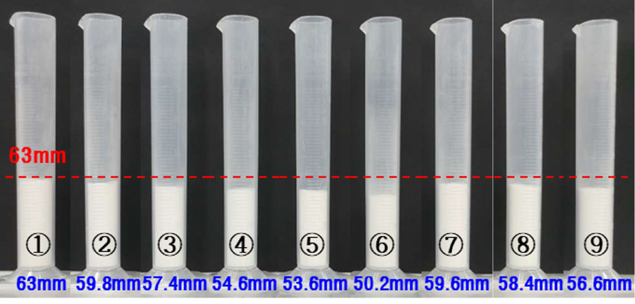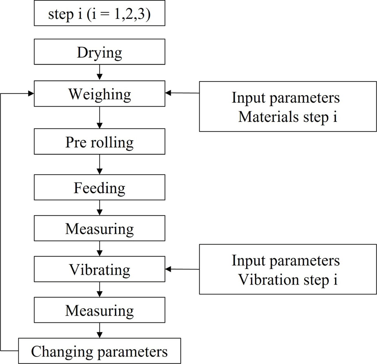 Fig. 2는 수행한 전제 실험 과정의 흐름도를 나타낸 것이다. 알루미나 분말의 습기 제거를 위해 실험 전 150 °C 오븐에서 2시간 건조를 진행하였으며, 혼합물 실험계획법에 의해 설계된 조건에 맞춰 알루미나를 계량하였다. 계량된 알루미나를 크기별로 분산시키기 위해 대형 광구병에 투입하고 롤 밀 위에서 1시간 동안 회전시켰다. 고르게 분산된 알루미나를 매스 실린더에 투입 후 가진 인가 전 초기 높이를 측정하고 가진 후 알루미나 파우더의 높이 변화를 다시 측정하였다.