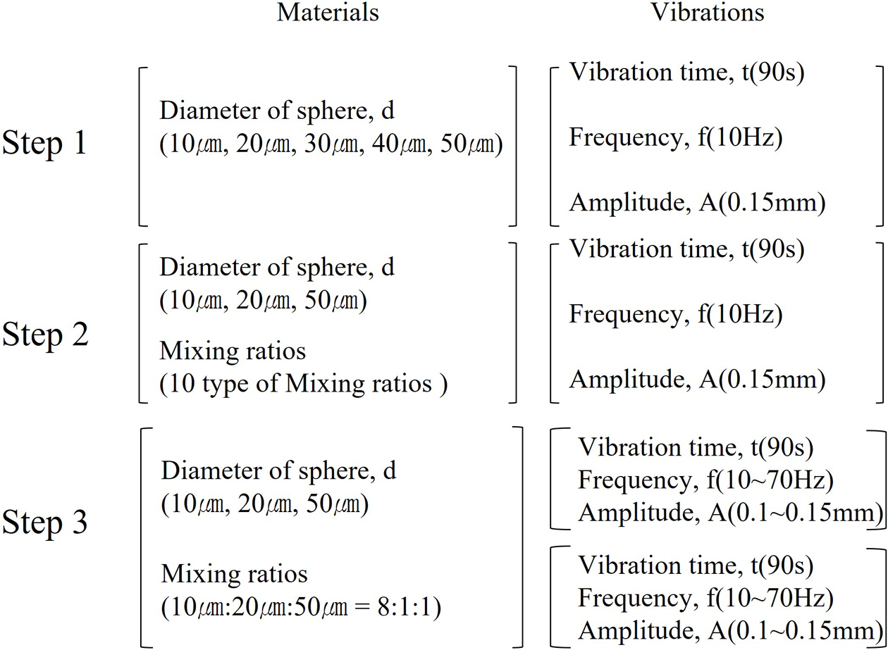 이 실험에 적용한 알루미나 파우더의 크기 및 가진 조건은 Fig. 3에 나타내었다. 알루미나 파우더의 충진률 분석을 위하여 3단계로 순차적으로 실험을 수행하였다.