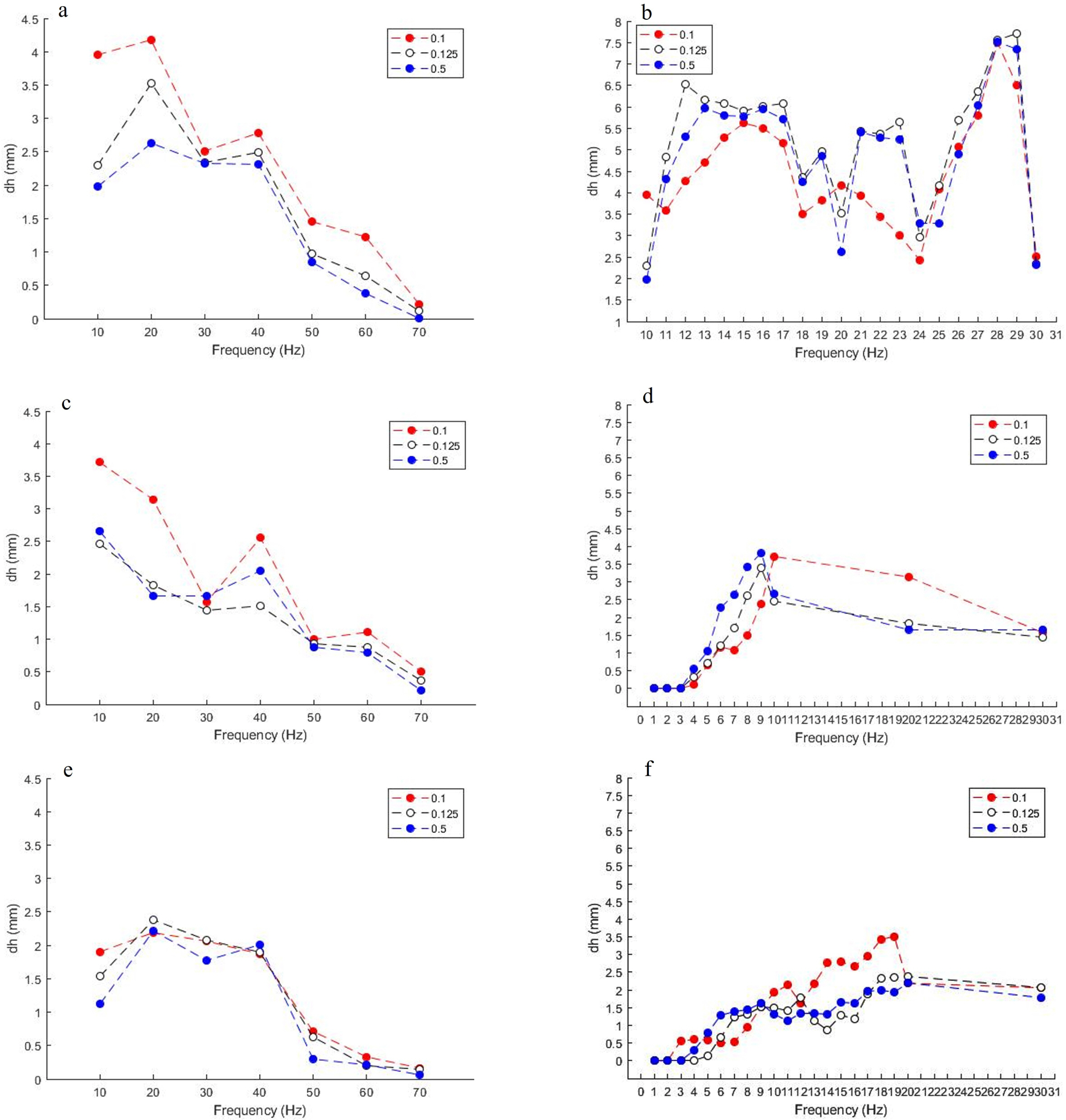 3단계 실험에서는 파우더 크기별 높이 변화가 가장 큰 가진 조건을 찾기 위하여 다양한 가진 주파수에 따른 실험을 세부 2단계로 나누어 진행하였다. 먼저 각각의 파우더 크기별로 주파수를 10 Hz에서부터 70 Hz까지 10 Hz 단위로 변경하여 시험하였다. 10 Hz 단위로 측정된 실험 결과에서 높이 변화가 큰 주파수 영역을 선정하고 1 Hz 단위로 세분화하여 추가실험을 수행하였다. 또한 진폭은 0.1 mm, 0.125 mm, 0.5 mm 3가지 수준에 대해 모두 실험하여 크기별 높이 변화를 측정하였다.