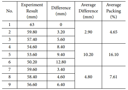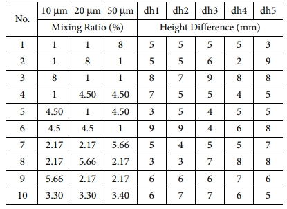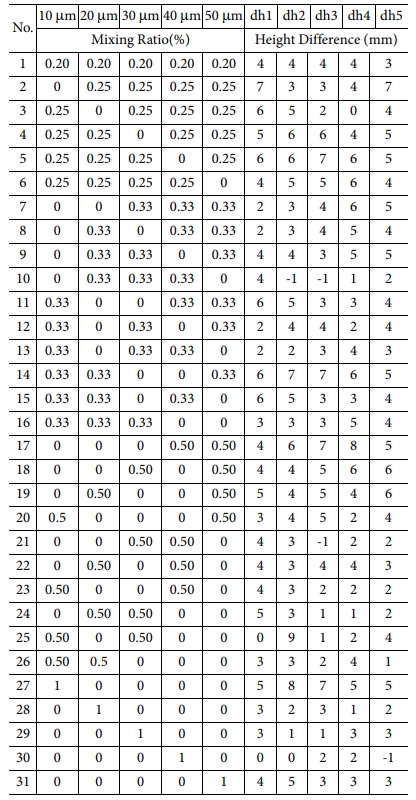 구형 알루미나 파우더 높이 변화에 영향을 미치는 크기 조합을 선정하기 위해 통계적인 분석을 수행하였다. Table 1은 31번의 실험 조건에 따른 155번의 실험 결과를 나타낸 것이다. 실험 결과값 중 양수는 구형 알루미나 파우더의 충진 높이가 낮아져 충진률이 높아진 것을 의미하며 음수는 충진 높이가 높아져 충진율이 떨어진 것을 의미한다. 실험 결과 발생한 편차는 미세분말에 가진할 때 분말간 불규칙적인 응집성을 보여주는 단적인 예이다[11]. 따라서 데이터간 신뢰도 및 정확성 확보를 위하여 반복 실험을 통한 통계적 방법을 적용하였다. 실험 데이터에 분산분석 수행 결과, 10 mm, 20 mm, 50 mm 3가지 크기의 알루미나 파우더를 혼합한 경우 높이 변화가 가장 많이 발생함을 확인하였다.