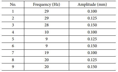 Fig. 7은 주파수, 진폭 및 알루미나 파우더의 크기 변화에 따른 높이 변화를 나타낸 것이다. 10 μm 크기의 알루미나 파우더는 1차 실험 결과 10 Hz~30 Hz 사이에서 가장 큰 높이 변화를 보인다. 이를 기초로 하여 10 Hz~30 Hz 사이의 주파수를 1 Hz 간격으로 더 세밀하게 추가 실험을 한 결과 진폭 변화에 따라 28 Hz와 29 Hz에서 가장 큰 높이 변화를 확인하였다(Fig. 7(a), (b)) 20 μm 크기의 경우 1차 실험 결과 10 Hz에서 가장 큰 변동을 나타낸다. 이를 기초로 0 Hz~ 10 Hz 사이의 주파수를 1 Hz 간격으로 추가 실험을 한 결과 진폭 변화에 따라 9 Hz와 10 Hz에서 가장 큰 높이 변화를 확인하였다(Fig. 7(c), (d)). 50 μm 크기는 1차 실험 결과 10 Hz에서 가장 큰 변동을 보인다. 이를 기초로 0 Hz~20 Hz 사이의 주파수를 1 Hz 간격으로 실험을 한 결과 진폭 변화에 따라 19 Hz와 20 Hz에서 가장 큰 높이 변화를 확인하였다. Table 3을 크기별 주파수 및 진폭을 도출한 결과이다. 1~3번 조건은 10 μm 크기에서 높이 변화가 큰 조건들이며 4~6번 조건은 20 mm 크기, 7~9번은 50 μm 크기에서 높이 변화가 큰 조건이다.