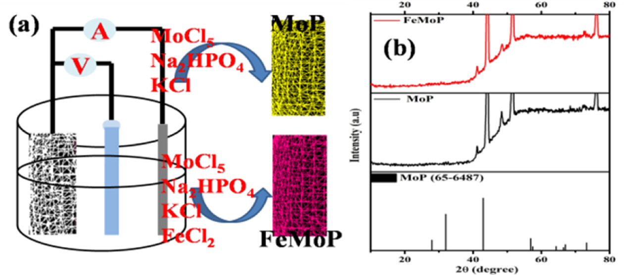 Fig. 1 Schematic of the electrodeposition processes (a), PXRD pattern of MoP and FeMoP material |