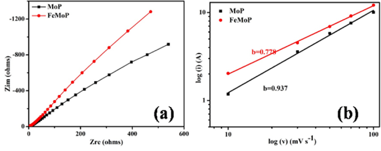 Fig. 4 Nyquist plot of the MoP and FeMoP electrode materials (a), log (scan rate) vs. log (peak current) plot (b) |