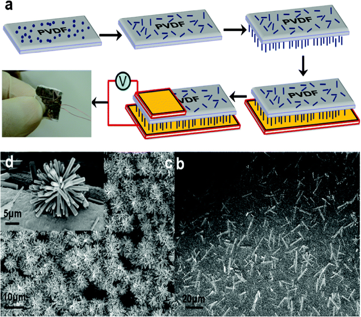 Fig. 4 (a) Structure and fabrication process of the PVDF–ZnO hybrid nanogenerator (PZHG). (b) The Scanning Electron Microscope (SEM) image of the ZnO NWs grown inside the PVDF film. (c) The SEM image of ZnO NWs covering the PVDF film surface for PZHG. (d) The high magnification image of the typical textured ZnO NWs grown on the PVDF film surface. Reproduced with permission [47] Copyright 2014, Royal Society of Chemistry Ltd. |