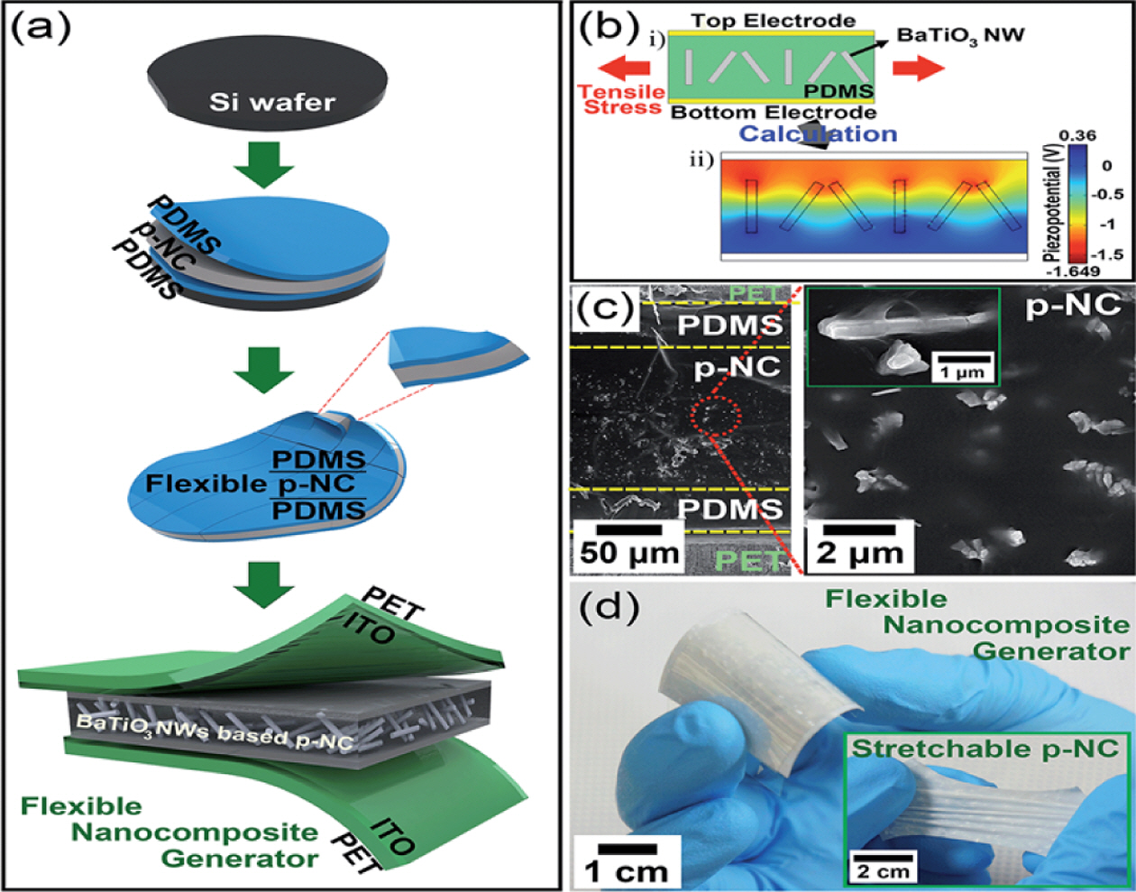 Fig. 5 (a) Schematic illustration of overall fabrication for BaTiO3 NWs-based NCG device. (b) Simulation model (i) of dispersed BaTiO3 NWs in a elastomeric matrix and calculated piezopotential distribution (ii) inside a p-NC layer. (c) The cross-sectional SEM images of the NCG device (left) and p-NC layer (right). (d) Photograph of a NCG device (3 cm × 4 cm) completely bent by human fingers. Reprinted with permission [59] Copyright 2014, Royal Society of Chemistry Ltd. |