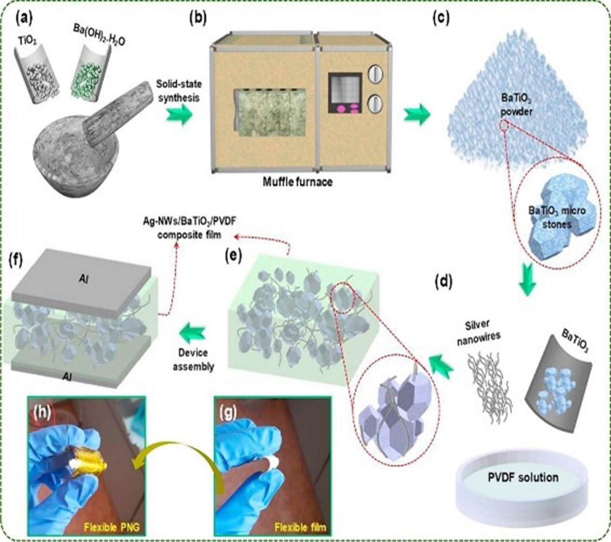 Fig. 6 Schematic diagram to demonstrate (a–c) the synthesis process of BTO micro stone-like architectures by a solidstate reaction route method and (d-f) the fabrication process of PNG device with Ag-NWs/BTO/PVDF composite film. Photographic images of the flexible (g) Ag-NWs/ BTO/PVDF composite film and (h) PNG with an active area of 2×2 cm2 . Reprinted with permission [71] Copyright 2018, Elsevier Ltd. |