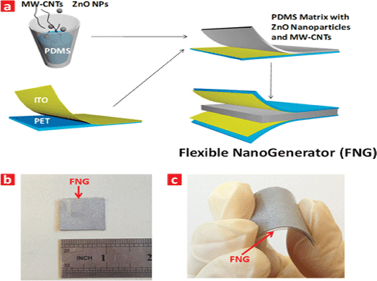 Fig. 7 (a) Schematic view and process flow of the flexible nanogenerator. (b-c) Photograph of the flexible nanogenerator