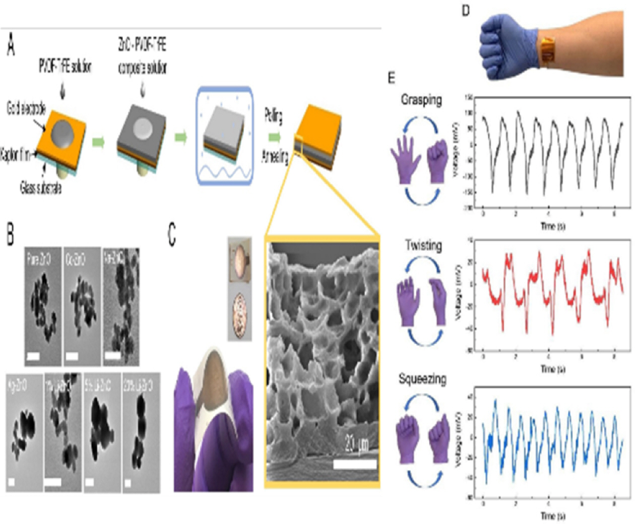 최근 몇 년간 인체의 움직임에서 수확할 수 있는 압전 에너지가 웨어러블 장치의 전원으로 사용될 수 있어 관련 연구가 수행되었다[85]. 압전 복합재료의 기지재로 사용되는 고분자 중 β상의 PVDF 및 이의 공중합체인 P(VDF-TrFE)는 압전 고분자로써, 재료의 유연성과 생체 적합성으로 인해 웨어러블 나노 발전기를 제조하기에 적합하였다[86]. Jin 등[87]은 Co, 나트륨(Na), 은(Ag) 및 리튬(Li) 이 도핑된 ZnO를 압전 재료로써, PVDF와 복합화 하여 제조한 복합재료의 압전 성능을 평가하고 다양한 손 제스처를 감지하는 유연한 웨어러블 모션 장치를 제조하였다. Fig. 8은 제조된 복합재료의 구조 및 손 동작에 따른 압전 특성을 나타낸다.