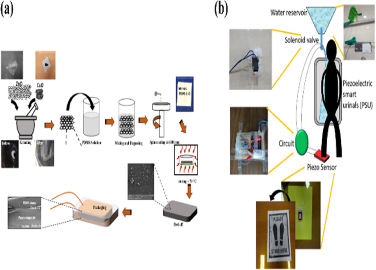 눌러주는 외력만으로 전기 에너지가 발생하는 압전 나노 발전기에서 지속 가능한 스마트 센서는 중요한 응용 프로그램이 되고 있다. Pandey 등[89]은 간단한 글라인딩 공정을 통해 n-ZnO:p-CuO 이종접합(ZCH)을 개발하였으며, PDMS와 복합화하여 ZCH/PDMS 나노 복합체 기반의 압전 발전기를 제작하였다. 제작된 압전 소자의 출력 전압 및 전력 밀도는 각각 9 V 및 0.2 mW/m2을 생성하였으며, 압전 기반 스마트 소변기에 적용되어 휴면 인터페이스 시스템의 구현을 위한 자체 전원 센서로 사용되었다. Fig. 9는 압전 나노 발전기의 제조 공정 및 응용을 나타낸다.