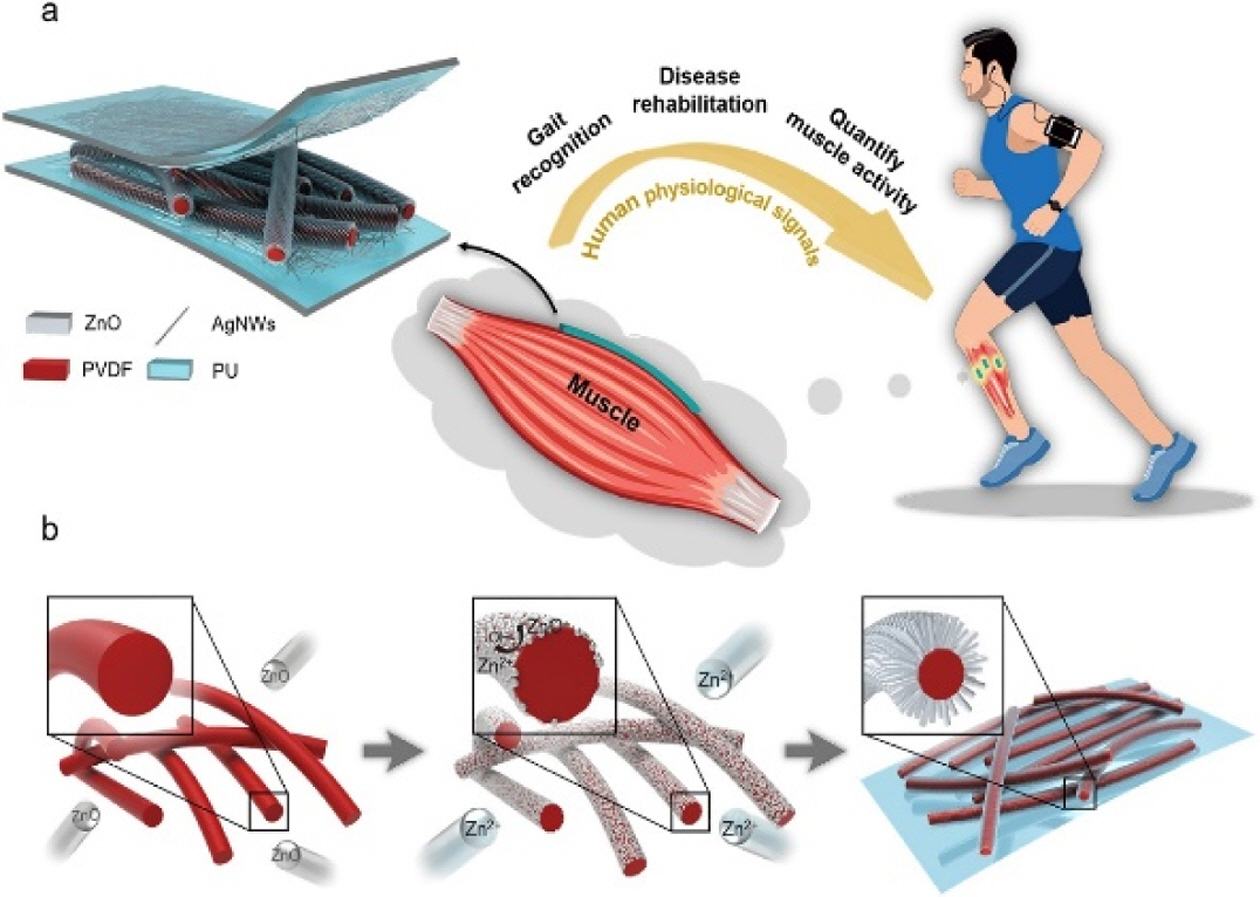 Fig. 10 The schematic diagram of the three-dimensional hierarchically interlocked PVDF/ZnO fibers-based PME for muscle behavior monitoring. (a) The PME conformally adhered to the calf muscle for the deformation monitoring. (b) The fabrication process of core-shell PVDF/ ZnO nanofibers. Reprinted with permission [92] Copyright 2020, Elsevier Ltd. |