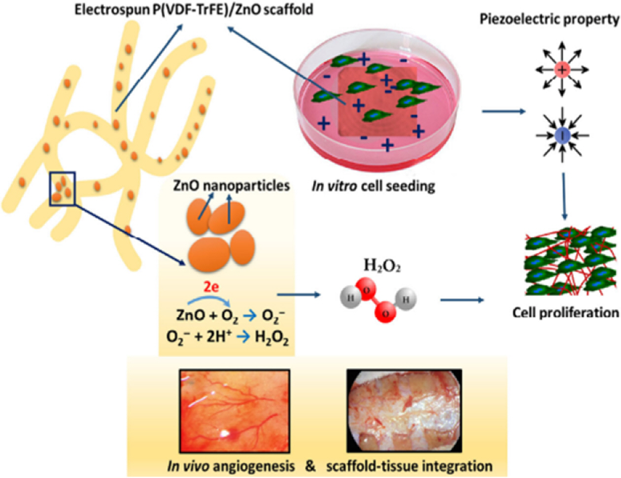 Augustine 등[93]은 전기방사를 통해 P(VDF-TrFE) 기지재에 ZnO 나노 입자를 통합하여 나노 복합 조직 공학 스캐폴드를 제작하고, 기계적 변형에 반응하여 전기 신호를 생성하여 세포의 부착, 이동 및 증식과 혈관 형성(혈관신생)을 촉진하였다. 제작된 스캐폴드는 시험관 내에서 생체 적합성 및 세포 독성 특성을 평가하였으며 P(VDF-TrFE)/ZnO 스캐폴드의 적합성이 확인되었다. P(VDF-TrFE)/ZnO 나노 복합 지지체에 배양된 인간 중간엽 줄기 세포(hMSC) 및 인간 제대 정맥 내피 세포는 순수한 P(VDF-TrFE) 지지체에 배양된 세포보다 더 높은 생존력, 접착력 및 증식을 나타냈으며, 혈관 형성을 촉진시켰다. Fig. 11은 나노 복합재료 스캐폴드의 압전 메커니즘을 나타낸다.