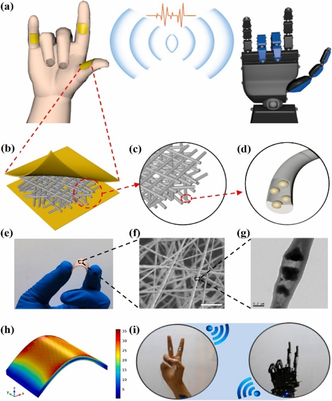 Fig. 12 The structure design of the CPZNs-based self-powered PES. (a) The schematic diagram of the developed smart sensor applied in the field of iHMI. The sketch of the device (b), NFs film (c) and a single NF (d). (e) The photograph of the fabricated sensor under bending mode. (f) The SEM image of the NFs. (g) The TEM image of a single NF. (h) The result of the FEM simulation. (i) The application of robot hand remote control based on the PES. Reprinted with permission [95] Copyright 2017, Elsevier Ltd. |