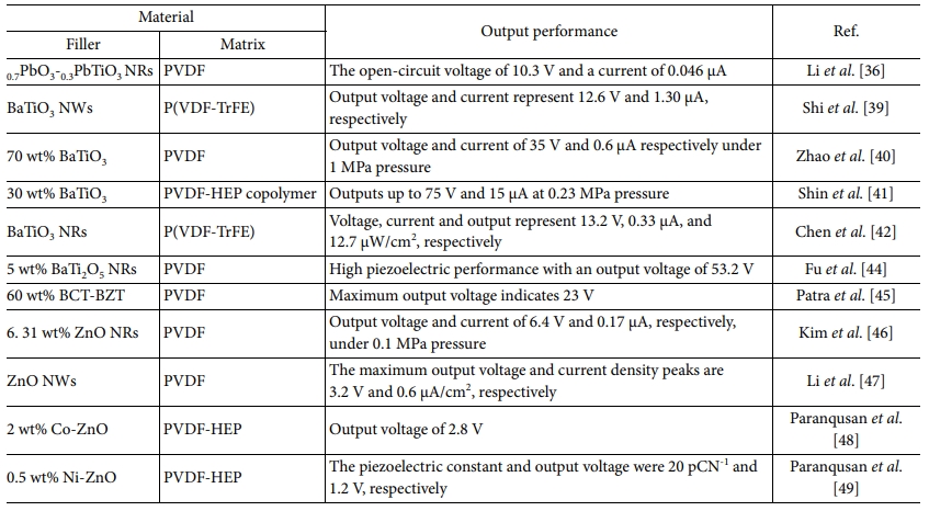 3성분계 압전 복합재료에서 2차 필러의 역할은 압전 기지재의 더 높은 β상 유도, 층간 bridge, 기계적, 전기적 및 유전 특성의 향상을 위한 필러의 역할 등을 가지는 것으로 보고되었으며, 압전 복합재료의 출력 성능은 Table 3에 정리되었다.