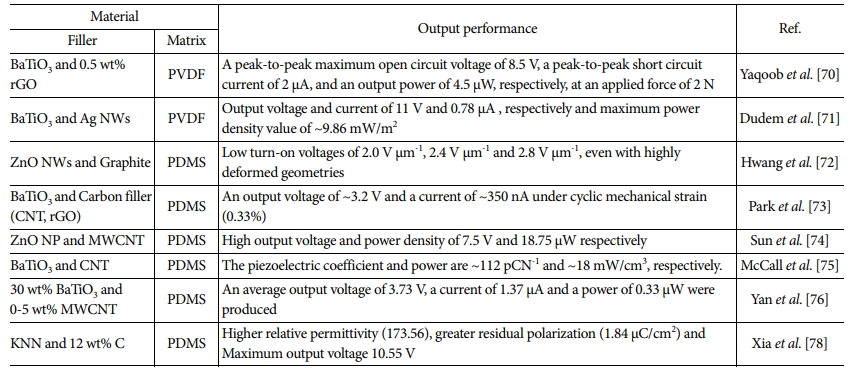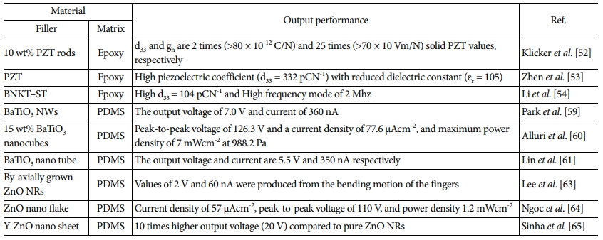 최근 친환경의 중요성과 더 유연한 압전 재료를 개발하기 위한 노력들은 PDMS 및 ZnO의 통합으로 이어졌다[62]. Lee 등[63]은 2축 방향으로 성장시킨 ZnO 나노 로드를 PDMS와 복합화하여 인공 피부에 내장된 센서의 전원으로 적용하였다. 제작된 압전 센서의 출력 전압 및 전류는 손가락의 굽힘 동작 하에서 각각 2 V 및 60 nA의 값이 생성되었다. 이 연구는 인공 피부에 통합된 자체 전원 센서에 에너지원의 제공 및 유연성을 기반으로 기계적 굽힘 동작에서 이식된 생체 의료 장치에 전기 에너지를 공급할 수 있음을 시사한다. Ngoc 등[64]은 100 nm 미만의 두께를 나타내는 ZnO 나노 플레이크를 합성한 후, PDMS를 코팅하여 유연하고 투명한 복합재료(ZnO/PDMS)를 제조하였으며, 57 μAcm-2의 전류밀도, 110 V의 peak-to-peak 전압 및 1.2 mWcm-2를 초과하는 출력 밀도를 달성하였다. 제조된 압전 하베스터를 사용하여 추가적인 저장 프로세스 없이 20개의 상용 녹색 LED에 전력을 공급할 수 있었다. 또한, Sinha 등[65]은 이트륨이 도핑된 ZnO 나노 시트를 PDMS에 합성하여 복합재료(Y:ZnO/PDMS)를 제작하였으며, 순수한 ZnO 나노 로드에 비해 10배 더 높은 출력 전압(20 V)을 달성하였다. 이트륨 도핑된 ZnO 나노 시트 기반 압전 에너지 수확 장치는 부드러운 손가락 탭(탭당 ~0.01 kgf)에서 매우 민감한 반응을 보였다. 압전 필러 및 유연한 고분자 기지재로 구성된 압전 복합재료는 Table 2에 정리되었다.