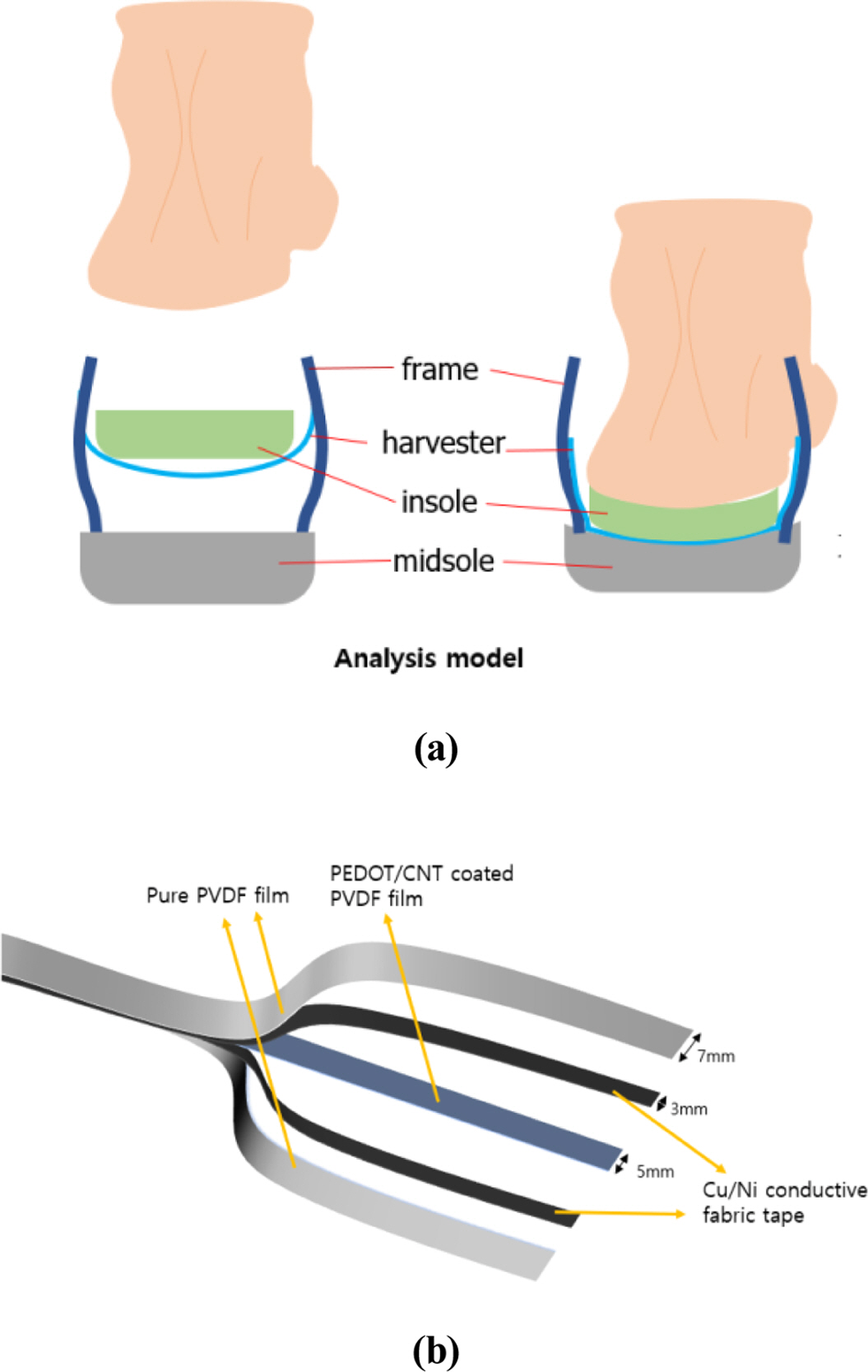 Fig. 1 Structures and material composition; Overall structure of the shoes, (b) Harvesting ribbons. |