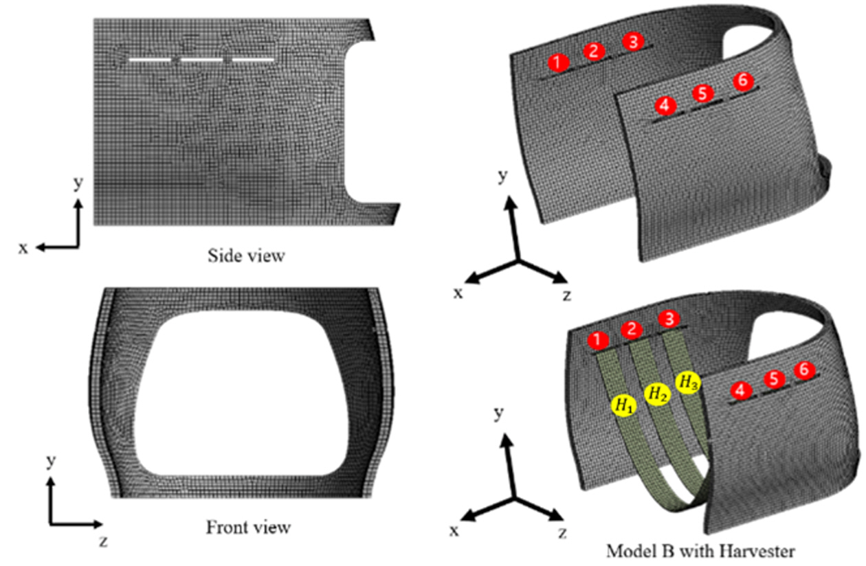 하베스터 리본의 변형량을 구하기 위해 하베스터 리본과 프레임이 없이 일반 신발의 구조를 스프링으로 모사하여 설계한 Model A와 프레임의 변형 패턴을 확인하기 위한 Model B로 나누어 구조설계를 진행하였다. 스프링은 ANSYS에서 제공하는 Contact 조건 중 Spring 요소를 사용하여 모델링 하였다(Fig. 2, 3 참조). Spring 요소는 Model A에서 각각 안창과 중창에 해당하는 부분에 양쪽 평면을 Body-Body 방식으로 Y축과 평행하게 연결하고 각 평면이 변형이 가능하도록 Deformable 조건을 주었다. 안창과 중창을 스프링으로 모사하여 구성된 모델을 이용하여 발에 의한 족압을 하중으로 부여하였다. Model B에서는 발에 의한 하중이 하베스터를 인장할 때 하베스터에 작용하는 장력을 프레임에 직접 부가하여 프레임의 변형거동을 해석하였다. 프레임에는 각 리본 체결용 구멍 1~6이 배치되어 있으며, 각 리본 체결용 구멍 1-4, 2-5, 3-6에 각각 리본 H1, H2, H3가 체결된다. 이 두 모델에서 구해진 해석 결과를 통해 하베스터 리본의 인장 길이와 프레임의 특성을 평가하였다.