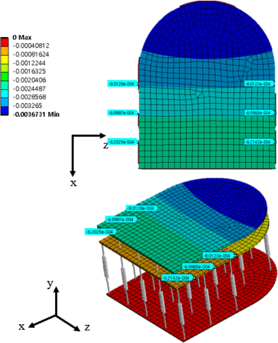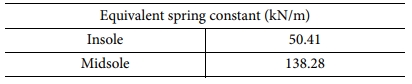 Model A의 안창과 중창 위치에 각각 21개의 스프링(스프링 상수 = 50.42 kN/m, 스프링 상수 138.28 kN/m)이 균일한 간격으로 배치되고, 중창의 아래 면을 고정된 것으로 가정하였고, 보행 시 하중에 대한 변형량을 확인하기 위해 Model A의 안창과 중창의 스프링과 평행한 평면에 모두 비마찰 지지 조건(Frictionless support)을 부여하였다. 하베스터의 변형량은 Y축 방향의 변위로 평가하였다. 스프링의 길이는 안창과 중창의 경우 각각 9 mm와 28 mm이다. 발의 뒤꿈치에 의한 하중으로 안창을 모사한 Model A에 가해지는 최대 하중이 체중에 약 3배만큼 작용한다고 가정하여 체중이 70 kg인 사람을 기준으로 2100 N 만큼의 Force를 직접 Model A의 안창의 위쪽 면의 수직방향인 -Y축 방향으로 부여하여 요한요소 해석을 통해 변형량을 확인하였다[20].