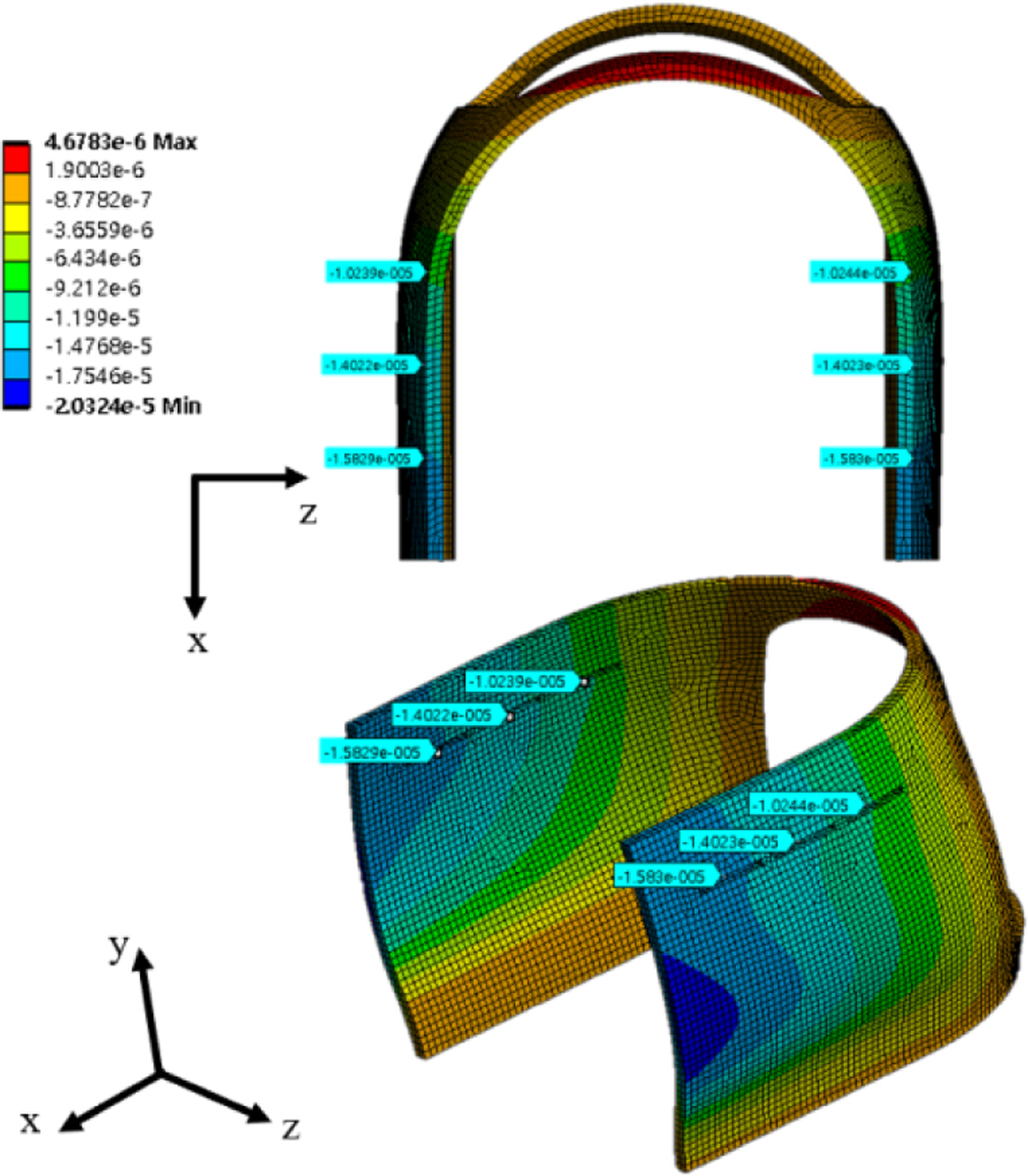 Model B에서는 프레임의 하단부를 고정하였으며, 보행 시 하중에 의한 하베스터 리본의 인장으로 프레임에 가해지는 장력의 방향이 -Y 방향이라 가정하여 각 리본 체결용 구멍에 -Y축 방향으로 2100 N의 하중을 균등하게 배분하여 부여하였다. 하베스터의 경우 2100 N의 하중을 부여하였을 때 각 Model이 변형이 없는 강체일 경우 프레임에 안쪽 면에 최대한 부착하였을 때를 변형량으로 가정하여 116.42 mm로 계산이 되었다.
