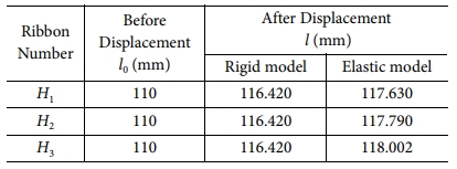 본 해석의 목표는 Model A의 중창의 Y축 방향 변형량과 Model B의 Hole 1-6의 Y축 방향 변형량을 계산하여 두 결과를 통해 스마트 슈즈에 최대 하중이 가해졌을 때 중창과 프레임의 구멍 사이의 거리를 파악하여 최종적으로는 하베스터 리본의 최대 변형량을 확인하는 것이다. 각 Model에서 구멍 1-6에 해당하는 위치를 기준으로 Model A와 Model B에서 각각 Y축 방향의 변형량을 해석하여 구멍의 위치에 따른 변형량의 차이를 비교하였다. Fig. 4에서 보이는 바와 같이, Model A에서 안창과 중창 모두 뒷축 방향(-x축 방향)으로 이동할수록 높은 변형량을 가짐을 알 수 있다. Fig. 5에서 보이는 바와 같이, 프레임에서는 x축 방향으로 이동할수록 높은 변형량을 보였으나, 하베스터 리본의 변형량에 비해 매우 낮은 수준의 변형이 발생함을 알 수 있었다. 각 Model의 리본 체결용 구멍을 기준으로 중창과의 거리의 변화량과 두 Model를 종합하였을 때의 하베스터 리본만의 변화량을 Table 3에 제시하였다. 두 가지 Model에서의 결과를 종합하였을 때 리본 체결용 구멍과 중창 사이의 거리는 하중에 의해 증가하였고, Model B에서의 변형량은 Model A에서의 변형량에 비해 아주 작은 값을 가지기 때문에 리본 체결용 구멍과 중창 사이의 거리의 차이는 Model A에의 결과가 더 큰 영향을 가진다는 것을 확인할 수 있었다. 따라서 Table 3에 정리한 바를 바탕으로 리본 체결용 구멍과 중창 사이의 거리를 통해 하베스터의 최종 인장의 길이를 예측하여 하베스터의 초기 길이와 각 Model이 강체일 때와 탄성체일 때의 변형 길이를 Table 4에 정리하였다. 리본 H1, H2, H3의 최종 인장량은 각각 7.630 mm, 7.790 mm, 8.002 mm임을 알 수 있었으며, 뒷축쪽으로 갈수록 더 큰 변형량이 발생하는 것을 확인하였다.