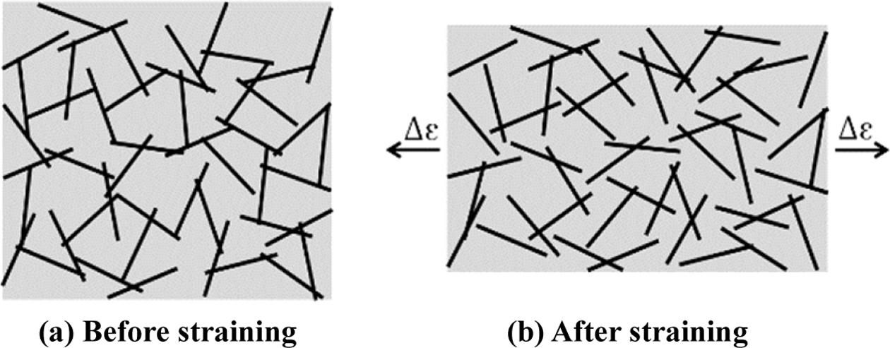 따라서 각도의 제한에서 벗어나 무작위 배열에 가까울수록 임계체적분율은 줄어들고, 반대의 상황에서는 커진다. 만약 외부 스트레인이 가해져 각도 배열에 제한이 주어지는 경우와 동일한 상태가 된다면, 그에 대응하는 임계 체적분율이 증가하는 만큼 식 (1)에서 전기전도도가 떨어질 것이다. 이러한 착상을 바탕으로 내부 SCF의 배열 각도와 외부스트레인과의 관계를 찾는다.