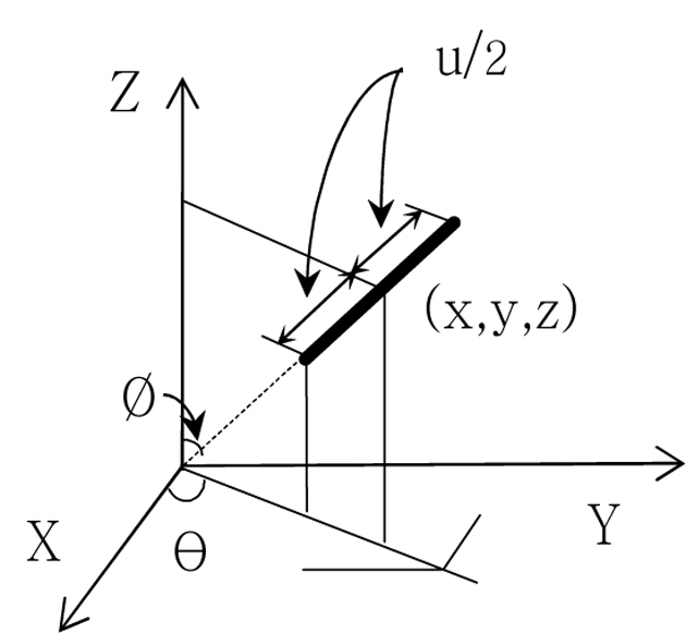여기서 u는 SCF의 길이, (x, y, z)는 무작위로 배열된 어떤 SCF의 중심점의 좌표, f는 SCF와 Z축이 이루는 각도,θ는 SCF가 X-Y평면에 투영되었을 때 X축과 이루는 각도이다.