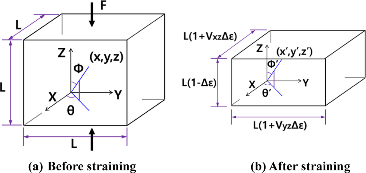 식 (4)와 (5)에서, L은 SCF를 포함한 미소정육면체의 한 변의 길이, ν는 프와송의 비, ∆ε는 Z방향의 압축스트레인, 위 첨자(')는 압축스트레인이 가해진 후 변화된 값, 아래 첨자(i)는 i번째 SCF를 의미한다.