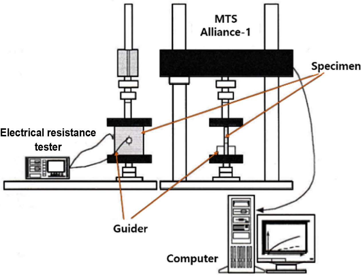 압축 실험을 위한 장비 구성은 Fig. 4와 같다. 시편을 압축했을 때 나타나는 반경방향 인장스트레인에 의해 변화하는 전기저항을 측정하기 쉽도록 MTS Alliance RT/1을 이용하여 1 mm/min의 속도로 변위제어 압축실험을 하였다. 시편 높이의 1/2지점에 전극을 접촉시키고 반경방향에서 초기 전기저항을 측정한 후, 가중되는 스트레인에 따라 변하는 전기저항을 압축스트레인 1%마다 측정하였다.