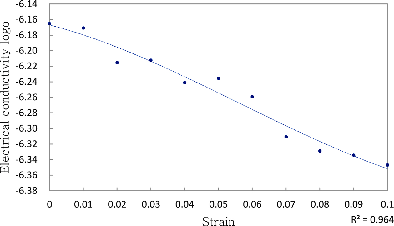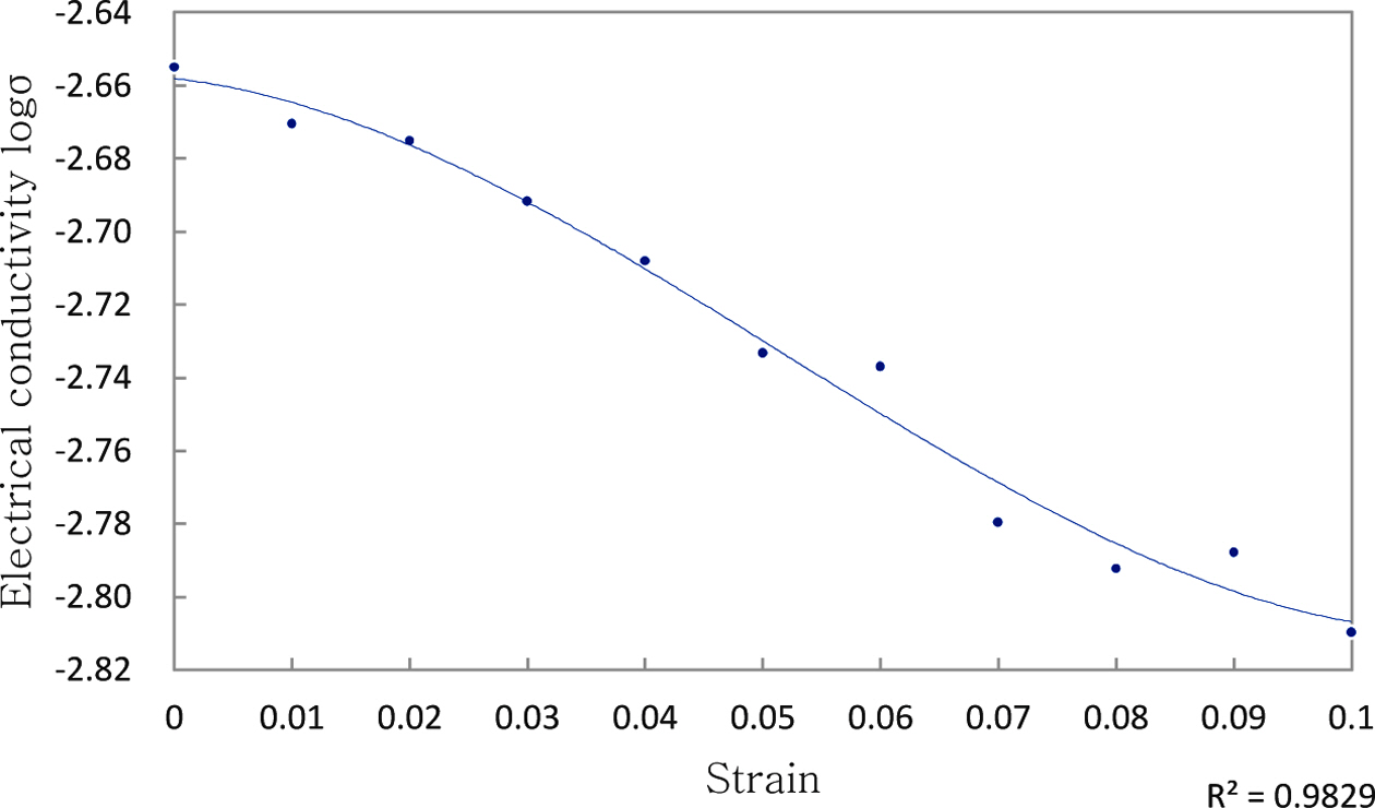 식 (12)에서 σ는 전기전도도, R은 전기저항 측정값, d는 전극 사이의 거리, A는 전극의 면적이다. 본 연국의 실험에서는 시편에 축방향(Z방향) 압축스트레인을 가하면, 반경방향에 인장스트레인이 발생하여 전극사이의 거리가 점차 멀어진다. 그러나 압축스트레인을 가할 때 나타나는 반경방향의 배럴링(barreling) 때문에, 그것을 정확하게 반영하기가 매우 어려웠다. 이에 전극사이의 거리를 초기 시편의 직경과 근사적으로 같은 값으로 고정하여 전기전도도를 계산하였다.