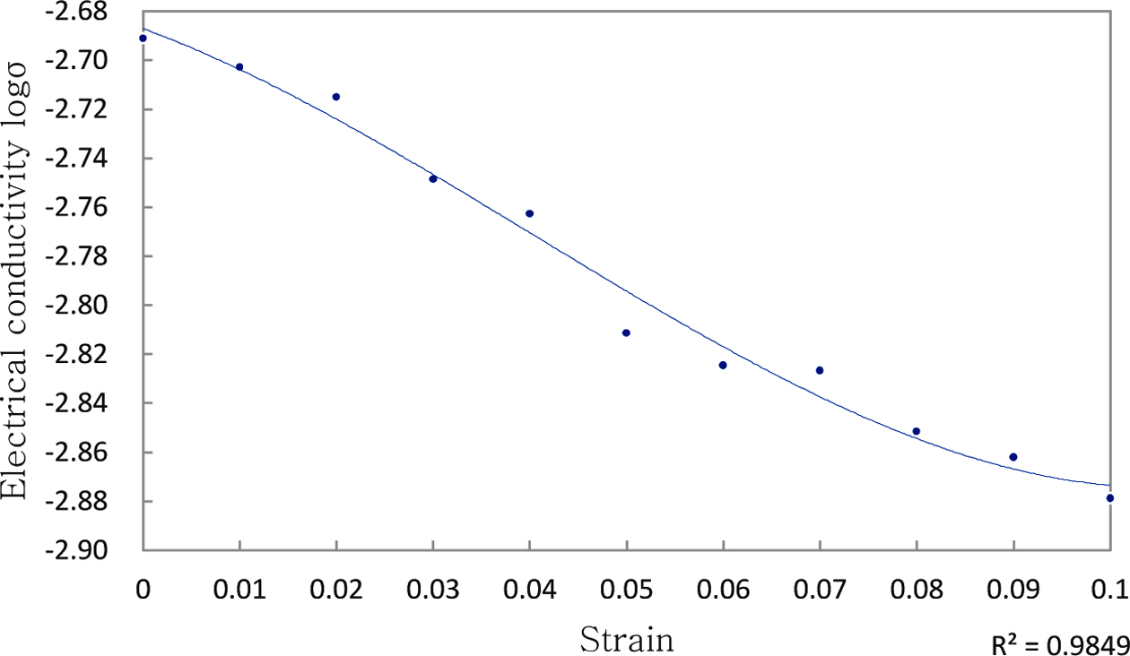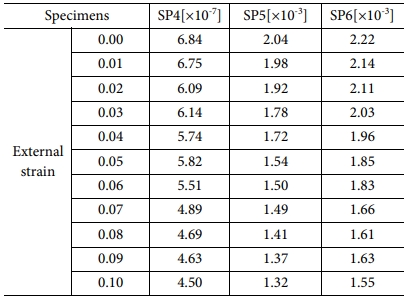Table 3의 데이터는 세 시편(SP4, SP5, SP6)에 외부스트레인이 가중될 때 변화하는 전기전도도이다. 종류별로 동일한 사양의 시편들에 대해, 축방향 압축실험을 실시하면서 측정한 전기저항의 평균값들을 식 (12)를 사용하여 전기전도도로 환산한 값이다. 전반적으로 Z축 방향에서 압축을 가할 때 반경방향의 인장스트레인에 따라 측정되는 저항이 점차 커지는 경향을 보였다. 스트레인을 10% 정도 가한 이후에는, 시편 표면에 나타나는 배럴링 형상이 시편 마다 불규칙 했기 때문에, 시편들 사이의 적절한 비교 검토를 위해서 이후 측정값을 생략하였다.