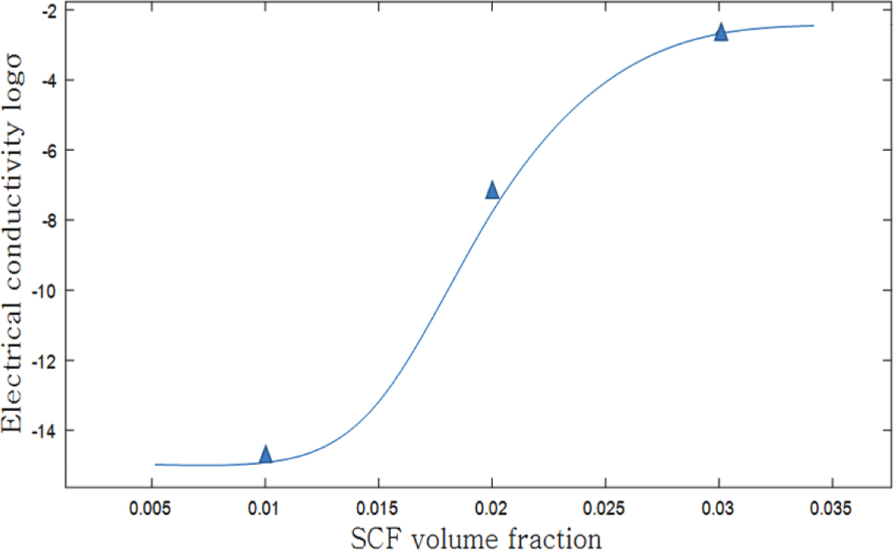 Fig. 9는 SCF 체적분율의 변화가 전기전도도에 주는 영향을 나타내는 그래프이며, SCF의 체적분율이 0.012정정일 때 시편에서 전기전도도의 변화가 나타나고 이후 급격히 증가하다 0.026정도에서 증가율이 급격히 감소하는 것을 보여준다. 그간의 실험이나 연구논문을 참고하면, 이후 0.03의 오른쪽 구간은 충전재를 계속 채워도 전기전도도의 상승이 매우 작고 정체된다. 이것은 충전재 들이 네트워크를 구성할 때 필연적인 접촉저항이 증가하기 때문이고, 실제로 충전재를 계속 추가해도 복합재료의 전기전도도가 충전재의 고유 전기전도도에는 미치지 못한다.