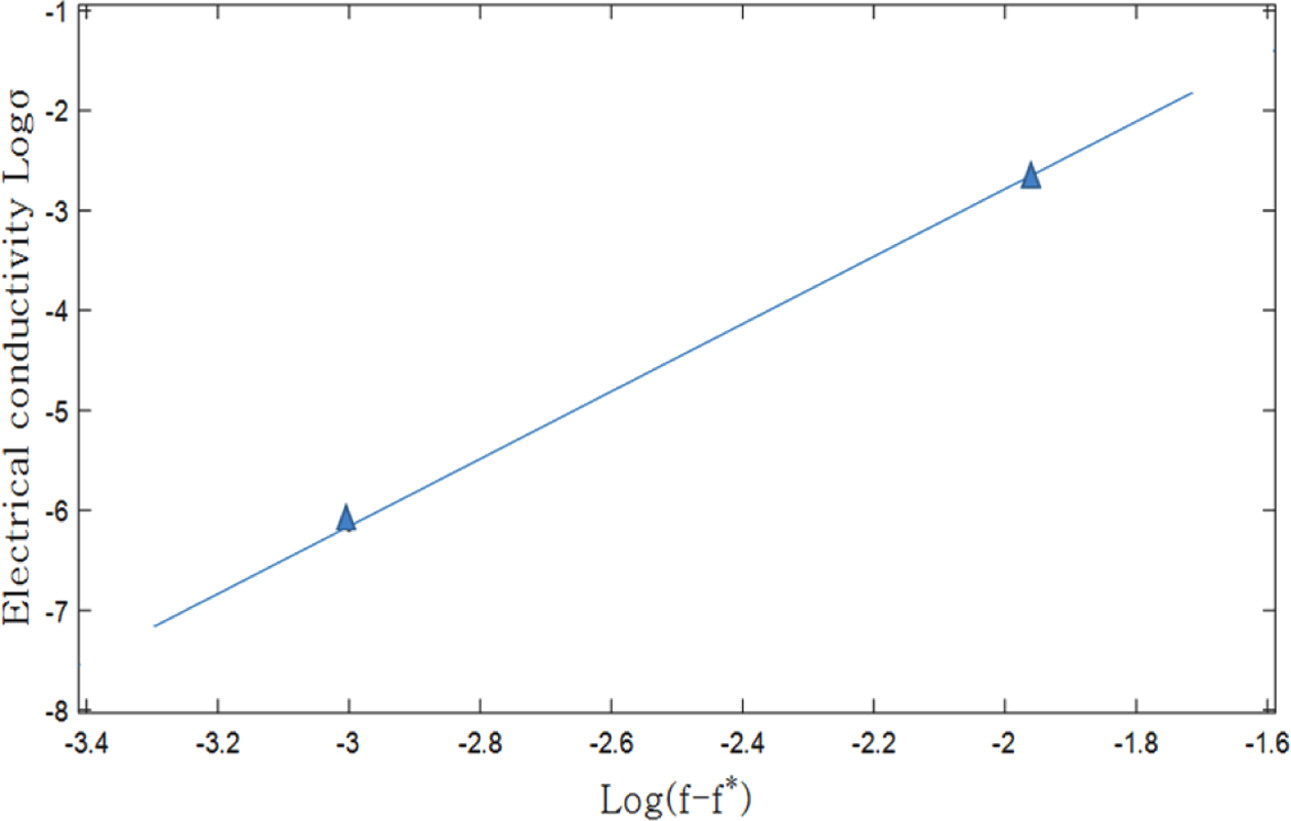 두 충전재를 혼합한 시편 2, 4, 6의 실험 데이터를 활용하여 Cohen의 식에서 임계체적분율과 전기전도도지수를 결정한다. 시편에 스인 니켈입자의 체적분율이 자력으로 퍼콜레이션 네트워크를 구성하려면 대략 0.43이상은 되어야 한다[15]. 그러나 시편에 쓰인 니켈입자의 체적분율은 0.05에 불과하므로, SCF의 체적분율이 전기전도도의 변화를 주도한다고 가정하고 해석한다.