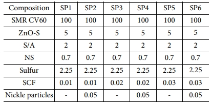 Table 1 Composition of the specimens(SP), [unit, PHR]. SCF and nickel particles are volume fractions |