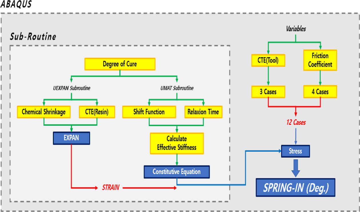 따라서 온도와 경화도의 변화에 따라 수지는 열팽창과 화학 수축이 발생하고, 이로 인해 복합재 구조물에 잔류응력이 발생하기 때문에 열변형을 예측하기 위한 서브루틴의 사용이 필요하다.