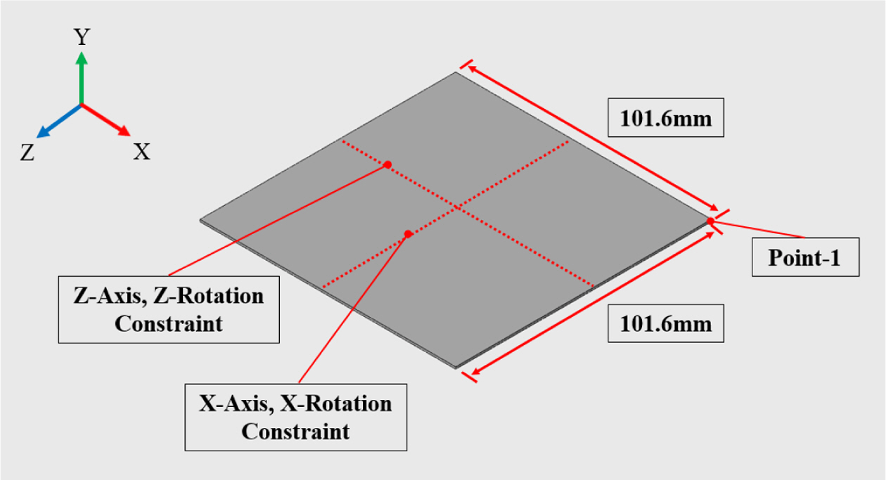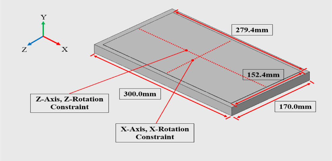 경계 조건은 실제 오토클레이브 성형 공정을 모사하기 위해 복합재 평판의 바닥을 Y-방향 고정, 열팽창과 화학 수축이 발생할 수 있도록 Fig. 2와 같이 설정했다.