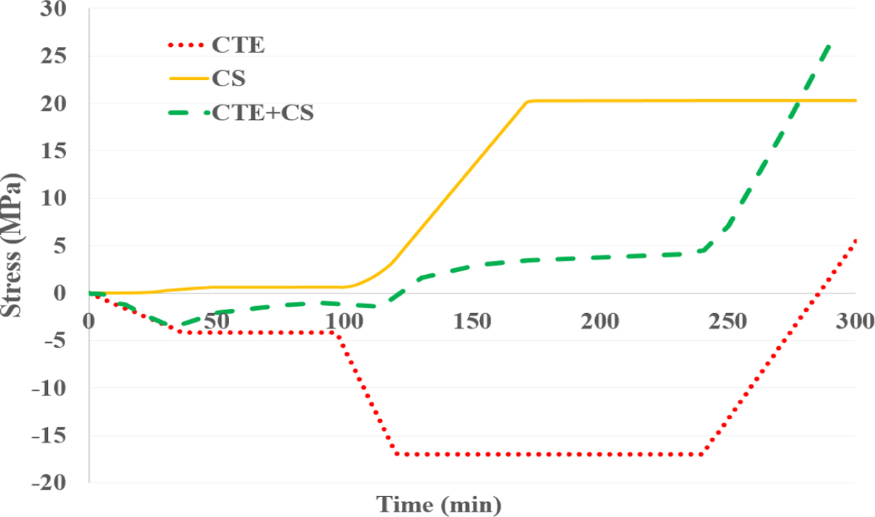 Fig. 4에서 열팽창을 고려한 모델의 잔류응력은 온도변화에 따라 지속적으로 변하는 반면, 화학 수축에 의한 잔류응력은 경화가 주로 이루어지는 100분에서 180분 사이에 증가했고, 경화가 거의 완료된 시점에는 미미한 변화를 보였다.