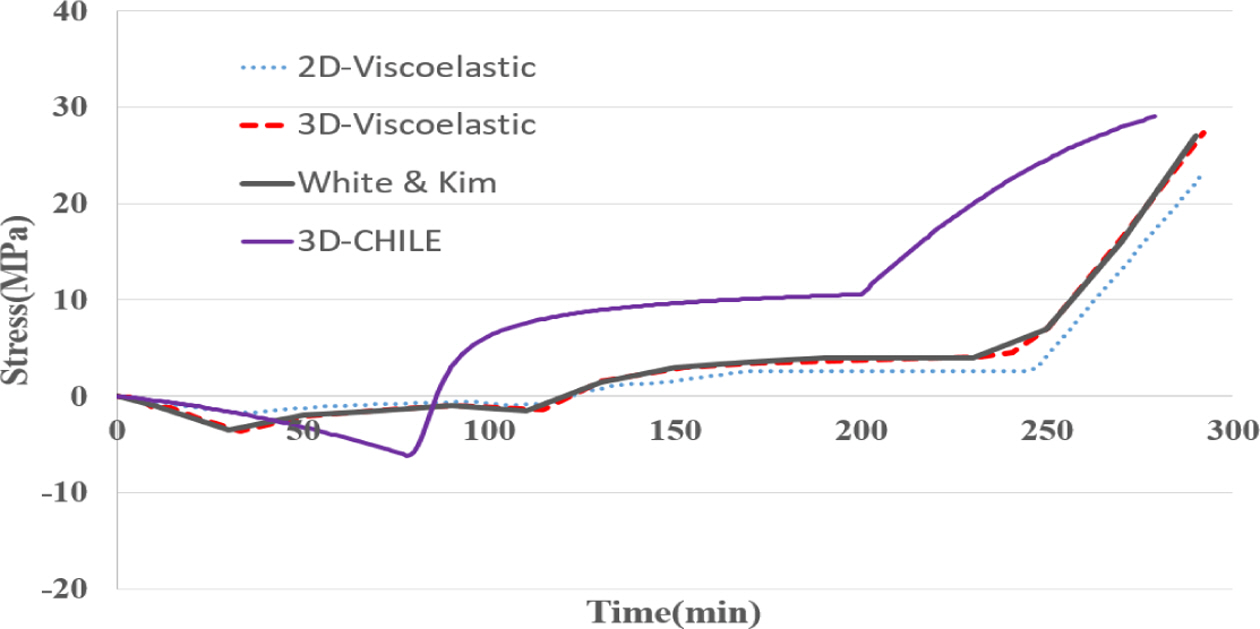서브루틴의 신뢰성을 확인하기 위해 점탄성 서브루틴을 적용한 2-D와 3-D 모델, White S. R.의 3-D 점탄성 모델[5], 3-D CHILE 모델의 응력 분포의 경향성을 비교했다. 점탄성 모델은 AS4/3501-6으로 모두 동일한 재료의 물성치를 사용했다. CHILE 모델의 경우 M55J/M18의 재료를 사용한 해석으로 점탄성 모델과 물성치는 다르지만 응력 분포의 경향성을 비교하기 위해 삽입했다. 응력 분포를 비교하기 위해 수지의 영향이 지배적인 σ22의 분포를 Fig. 2의 Point-1, 1st 0° ply에서 도출했다. 해석 모델의 경계조건 및 하중, 형상은 3.1에서 언급한 것과 동일하게 해석을 진행했다.