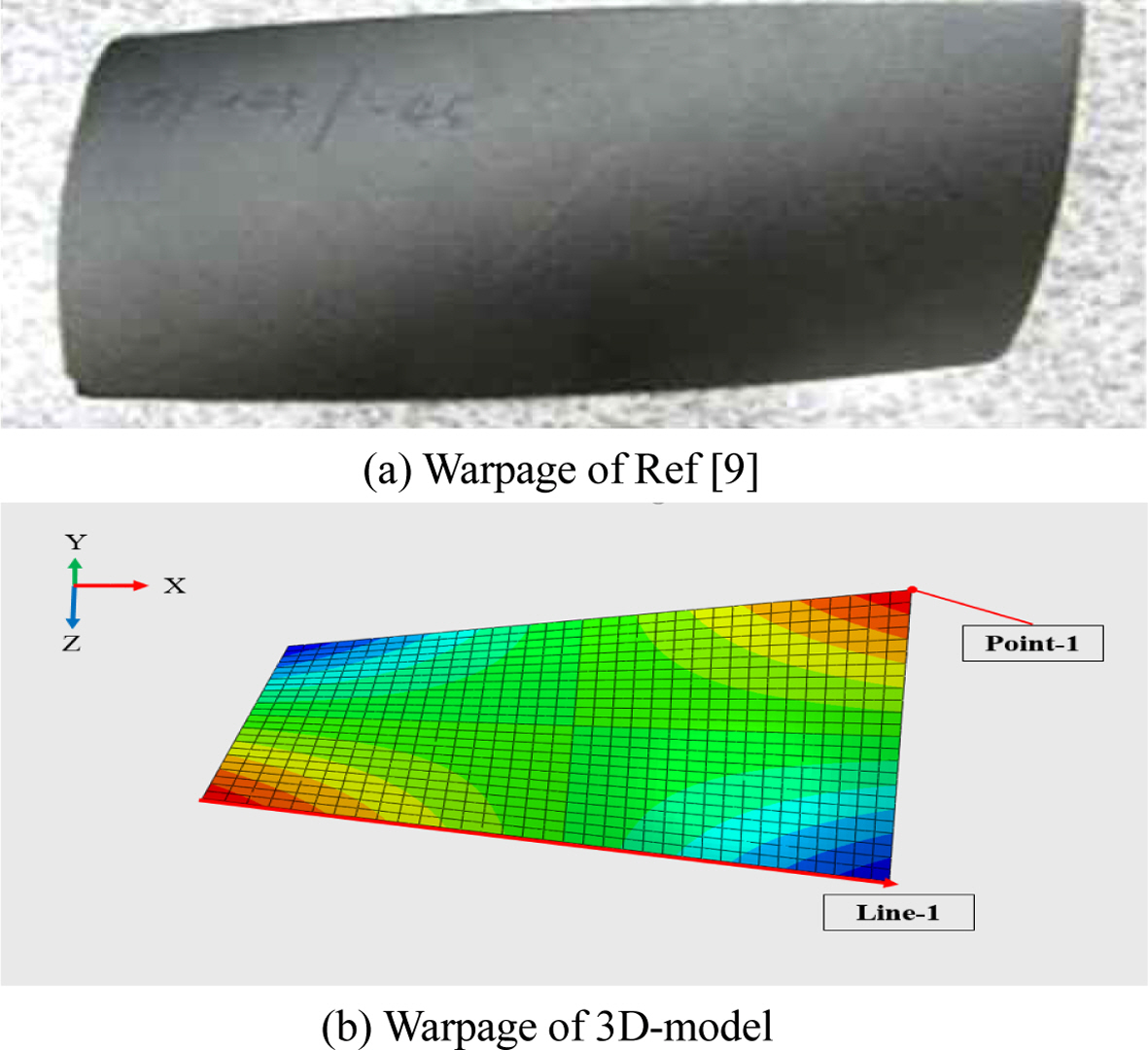 Fig. 8은 모델 1의 변형 결과 사진이다. Fig. 8-(a)는 모델 1의 실험결과 변형 사진, Fig. 8-(b)는 몰드를 고려한 3-D 모델 해석결과 변형 사진이다. 실험결과 사진과 해석결과 사진을 비교했을 때 동일한 뒤틀림 형상을 가지는 것을 확인했다. 잔류응력은 Fig. 8-(b)의 Point-1, 1st ply에서 도출했고, 뒤틀림 결과는 Line-1의 따라 Path를 설정하여 선행연구와 동일한 방법으로 결과를 도출했다.