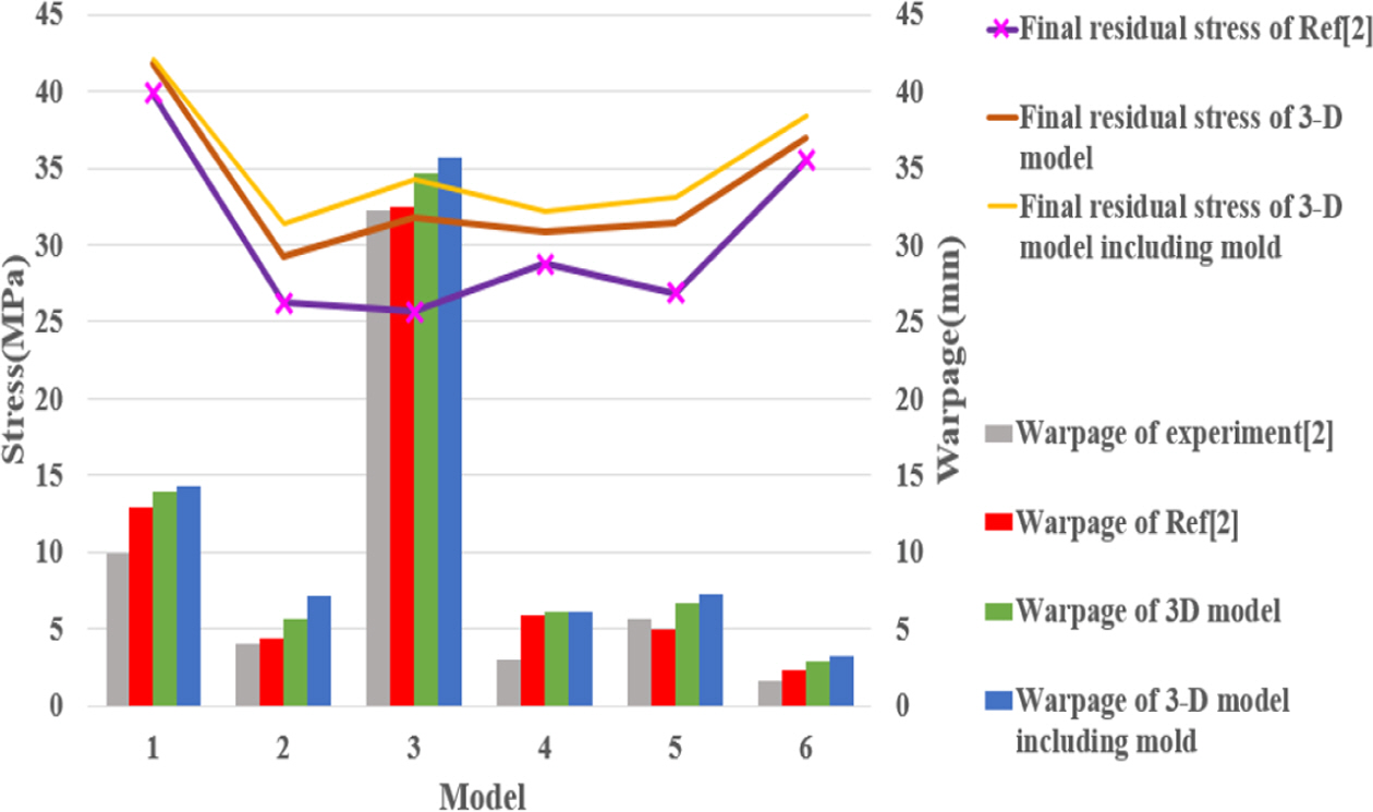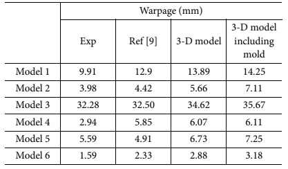 추가로 몰드를 고려한 3-D 점탄성 모델의 해석 신뢰성을 확인하기 위해 선행연구[9]와 몰드의 고려 유무를 나눈 3D 점탄성 모델 해석결과를 비교했다. 선행연구의 해석 모델은 비대칭 적층 모델이며, 몰드를 고려하지 않은 2-D 점탄성 모델이다.