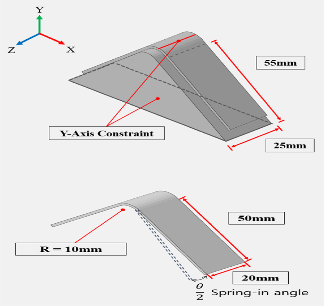 3.3에서 평판 해석을 통해 몰드를 고려한 3-D 점탄성 모델 해석 기법을 검증했다. 검증된 해석 기법을 사용하여 몰드 효과를 분석하기 위해 선행연구[3]을 참고했다. 선행연구는 몰드의 재료에 따른 열팽창 계수와 마찰 계수를 달리 하여 스프링 인 거동을 CHILE 모델 해석 기법을 통해 분석했다.