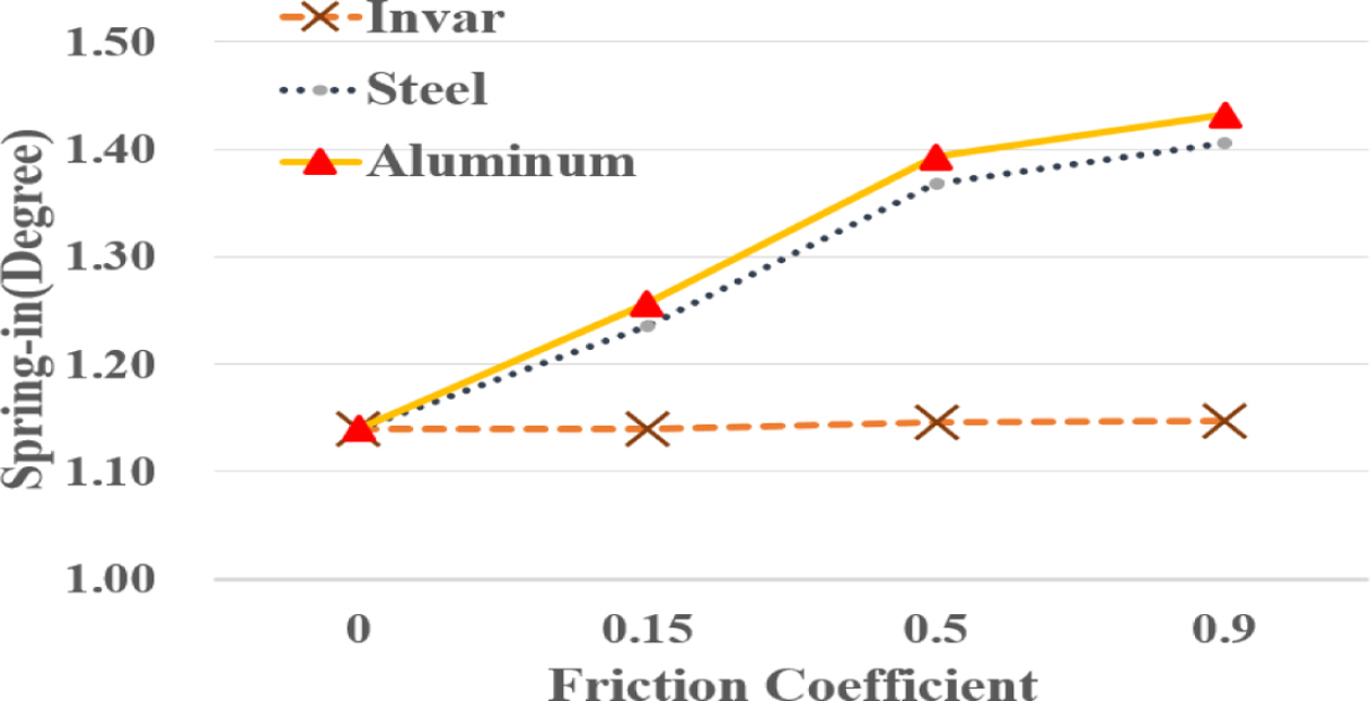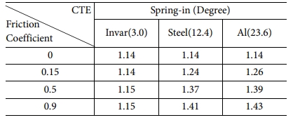 해석결과 동일한 열팽창 계수의 몰드를 고려했더라도 마찰계수가 클수록 스프링 인이 증가하는 경향을 나타냈다. 열팽창계수가 23.6으로 가장 큰 열팽창계수를 가진 알루미늄의 경우 마찰계수가 0.15일 때에 비해 0.5는 10.32(%), 0.9는 13.50(%) 크게 나타났으며 변화 폭이 증가했다. 작은 열팽창계수를 가진 Invar의 경우 마찰계수가 0.15일 때에 비해 0.5는 0.87(%), 0.9는 0.87(%)로 변화 폭이 미미하므로 복합재 몰드로 적합한 것으로 기대된다.