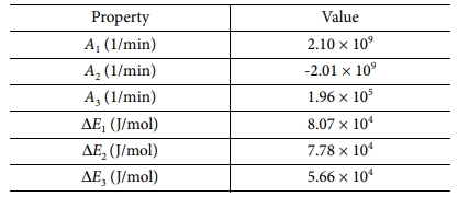 식 (2)에서 Ki(i=1,2,3)는 아레니우스 식으로 수지의 화학반응에서 반응속도상수와 온도의 관계를 나타낸 식이다. Ai(i=1,2,3)는 빈도계수이다. ΔEi(i=1,2) 는 활성화 에너지이며 R은 일반기체상수, T는 절대온도이다. 각각의 상수들은 Table 1과 같다[11].